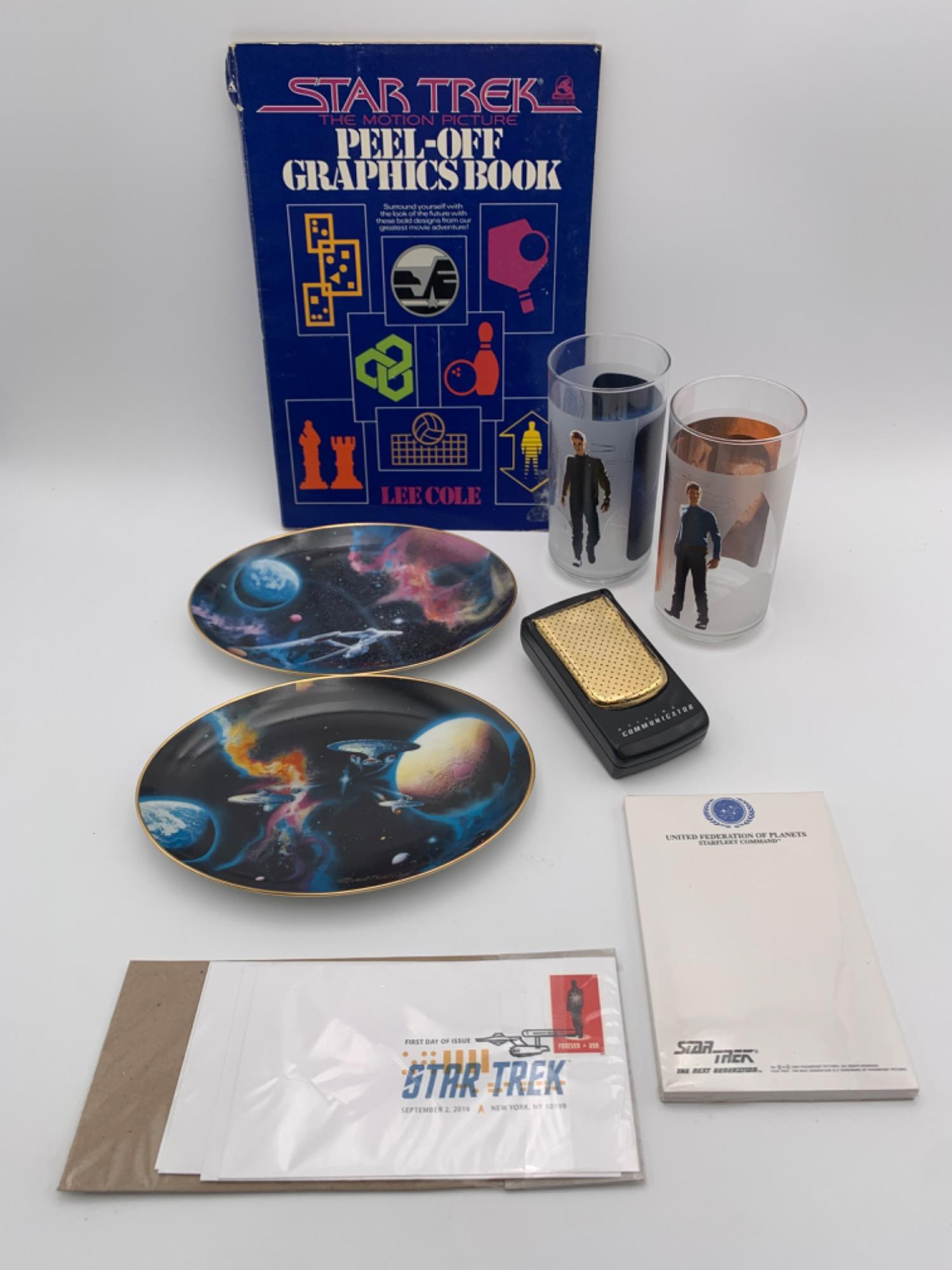 Lot # 78 - Star Trek Novelty Bundle - Stickers/Glasses/Garage Opener/Plates +