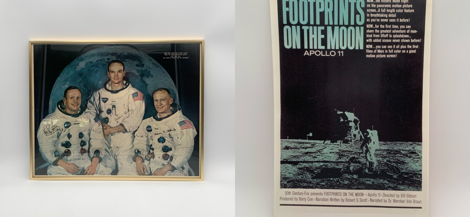 frame – measures 20.5” H x 16.5” W framed. In good condition with one slight flaw noted behind the glass next to the left frame - see last photo. “Footprints on the Moon” promo poster for the