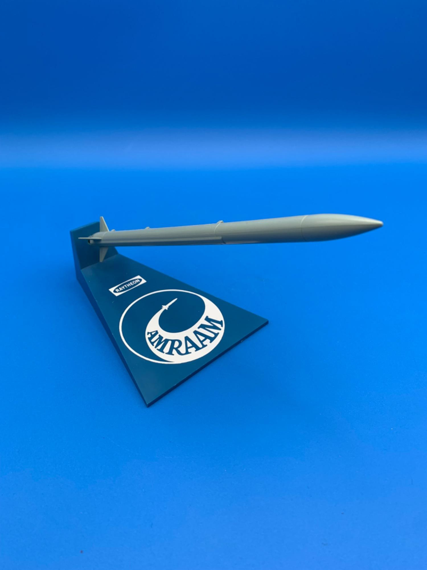 Desktop model of Raytheon's ARAAM (Advanced Medium Range Air-to-Air Missile). This one is exceedingly plain with no insignia - we assume this is how the model is supposed to look since our client was nothing but thorough! Smooth grey plastic on a blue single pillar mount in the tail of the missile. No makers mark; in pristine condition with no noted flaws.