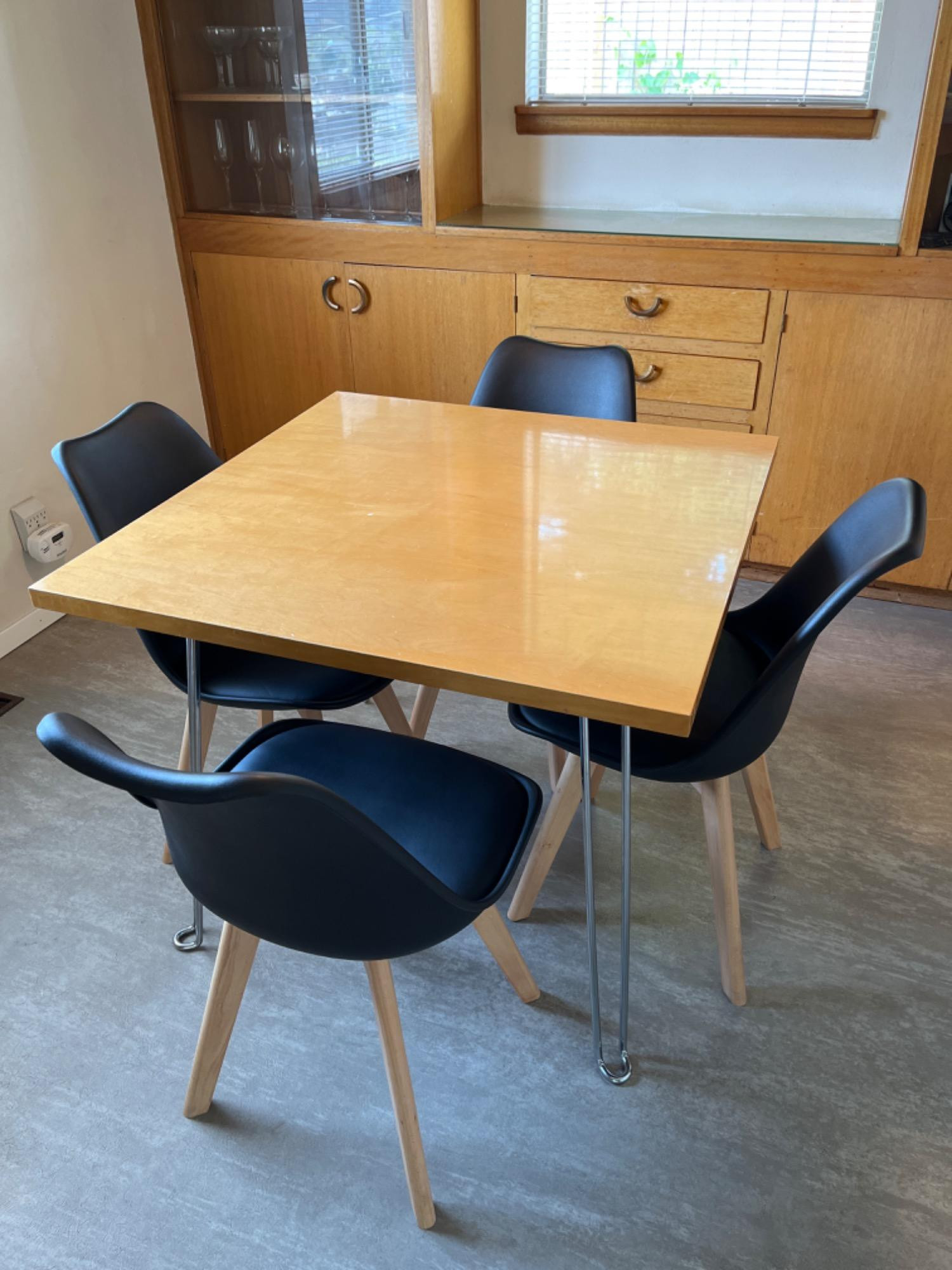 Solid Wood Table and Mid-Century Style Dining Chairs. This solid table has metal frame legs that fold flat for ease of portability. Each comfortable chair has wooden legs and a molded plastic body with a cushioned, faux leather seat. Table dimensions: 35 3/8 L x 35 3/8 W x 29” H Chair dimensions: 18” W x 21” Deep x 31 1/2” H Bidding on this lot is an agreement that: (1.) You