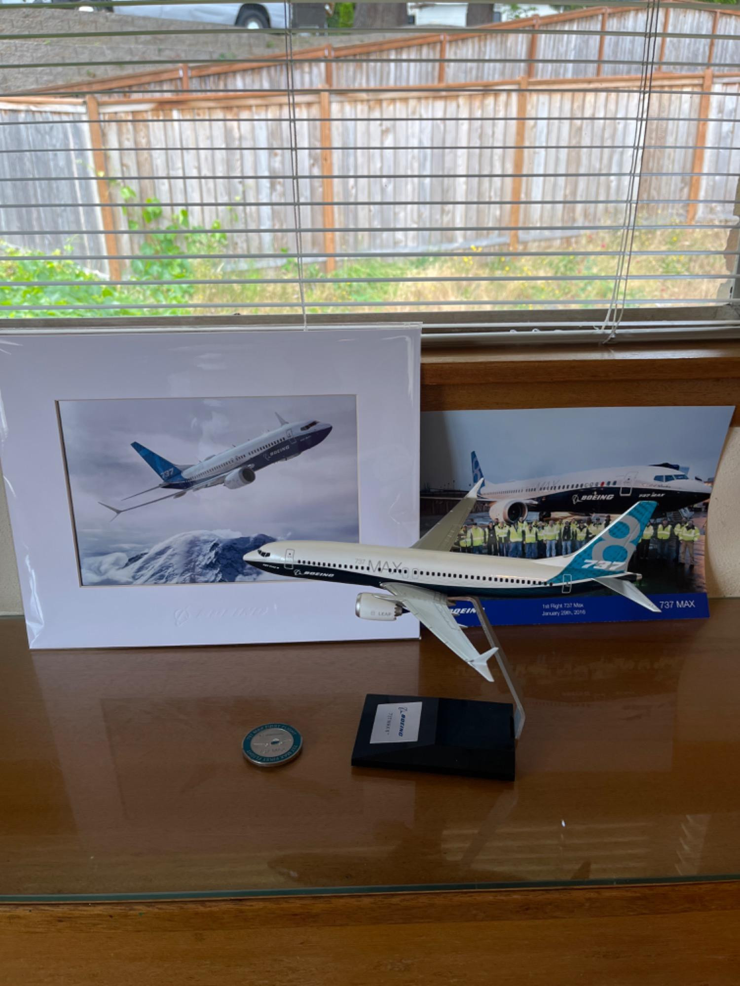 Boeing 737 Max 8 Collectibles The Boeing 737 Max 8 1:144 plastic model has been reproduced from Boeing engineering drawings. It is an exact representation of the full-size plane. A matted photo of a Boeing 737 airplane A photo of the deck crew and plane of the 1st flight of the 737 Max 737 Max First Flight Commemorative Coin. The beautiful color and weight of the coin make it one to stand out.