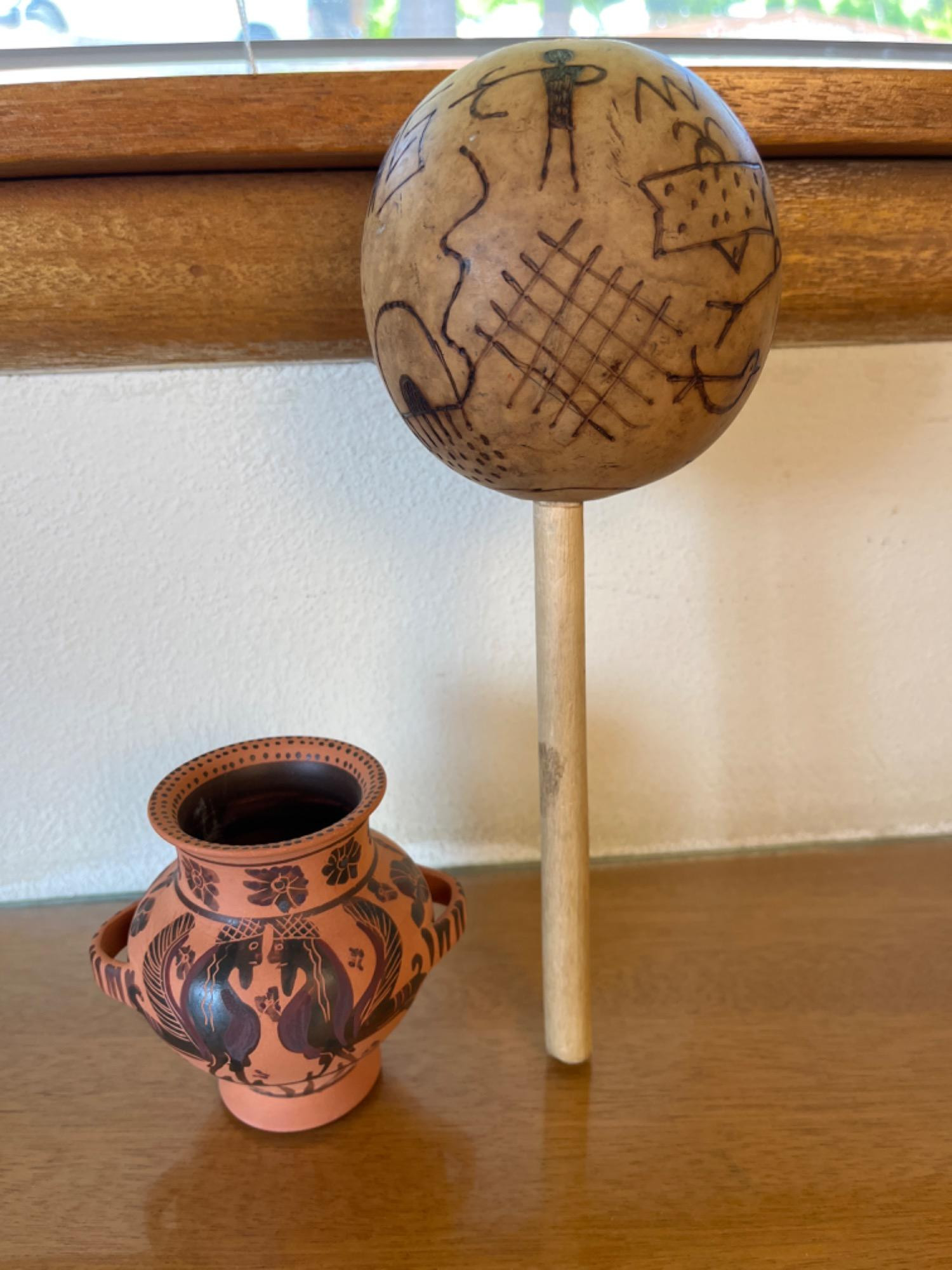 Mayan Rain Dance Rattle & Greek Pottery A skillfully, hand painted redware vase with handles from Greece. The shape of this vessel and the handle placement make it appealing and the painted designs are intricate. The card accompanying the vase reads, "This is a small ceramic vessel that replicates the usual and small animal figurines found in the sanctuary of the Nymphe on the southern slope of the Acropolis."