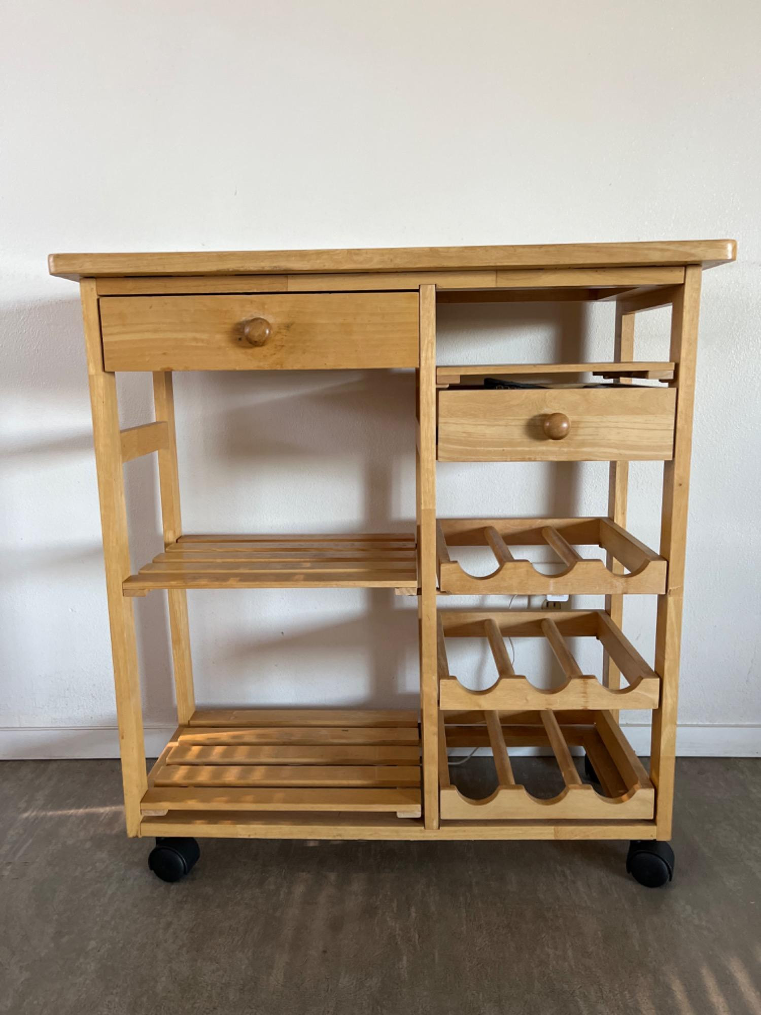 Wooden Wine Cart with Tiled Top It features 3 slatted shelves for all your storing needs and a tiled top (1 tile is slightly cracked - see photos) 2 drawers 3 shelves with cut-out spaces to accommodate 9 bottles of wine Bidding on this lot is an agreement that: (1.) You