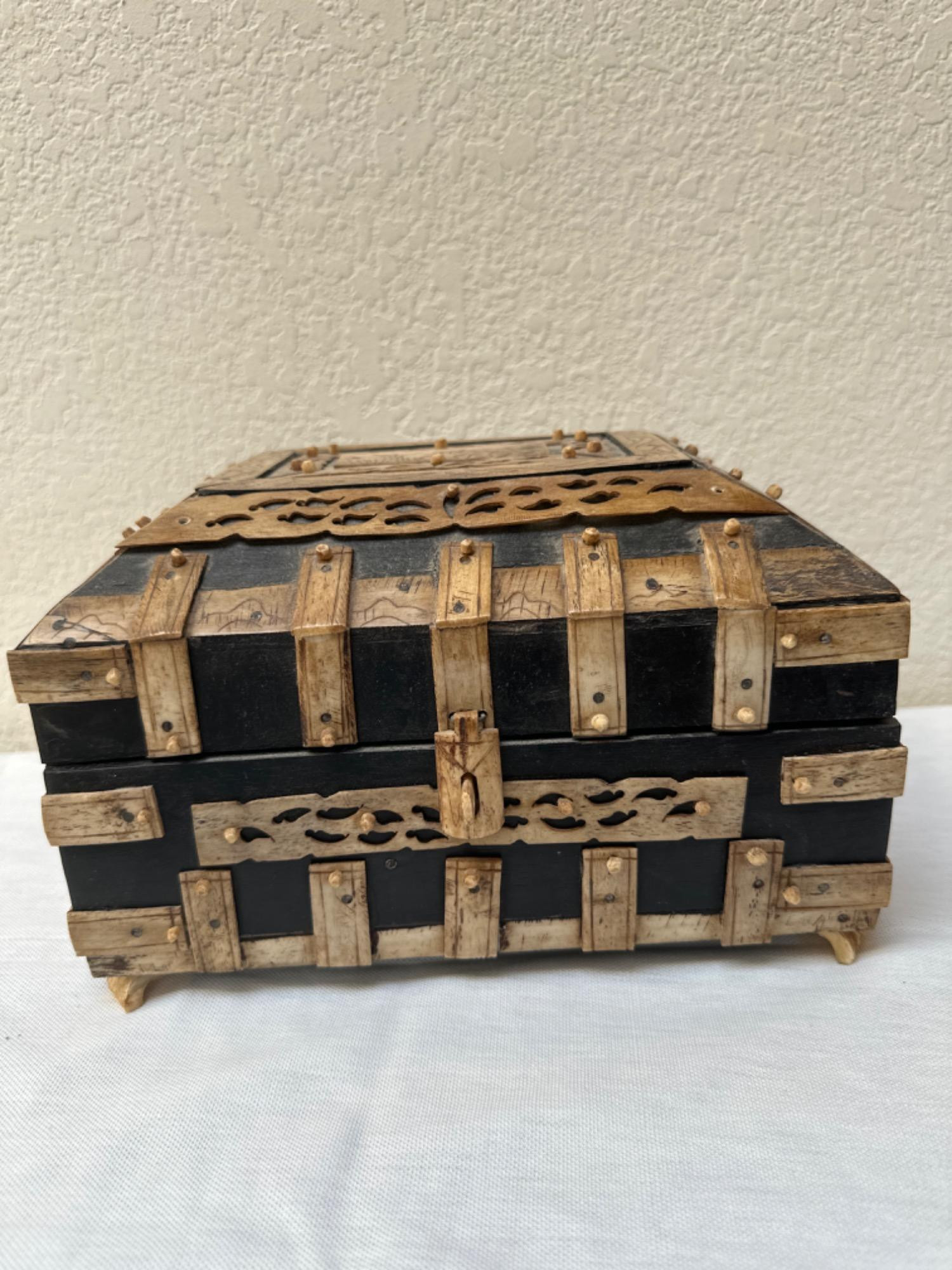 Anglo- Indian Mughal Footed Box- Bone Overlay. Wood material. Anglo-Indian Vizagapatam Bombay Mughal Style Footed Box With Bone Overlay. Nice and unusual Indian Mughal style large decorative box, filigree and carved horn.