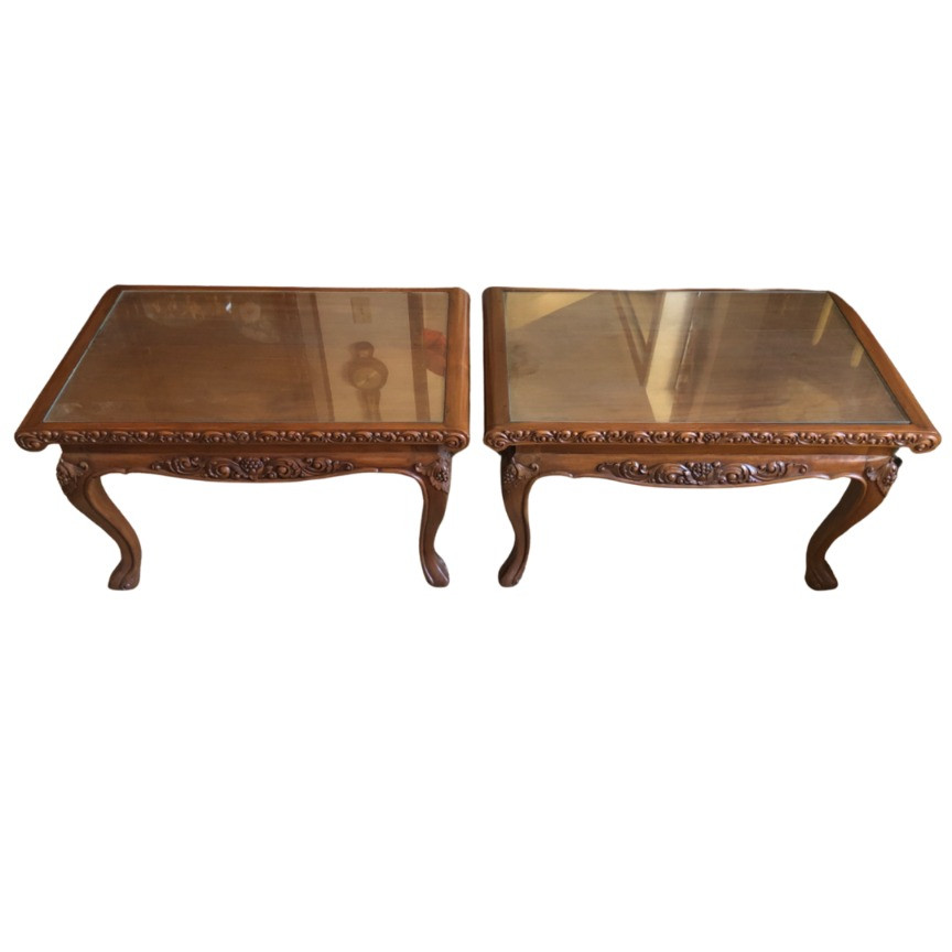 The two end tables are made of teak wood, known for its durability and rich, warm brown color. They feature intricate carvings on the sides and legs, showcasing skilled craftsmanship. The tables have a glossy finish that enhances the natural beauty of the wood. Each table is equipped with a removable glass top insert.