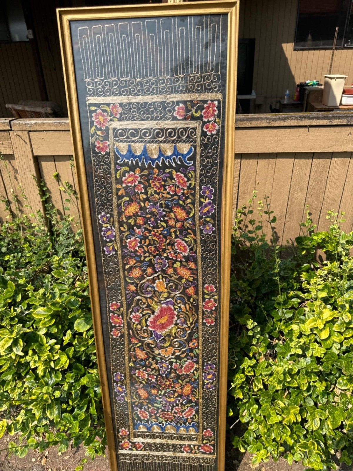 Decorative panel with intricate patterns and designs. Made from silk or a silk-like synthetic fiber. Wooden frame. Measurements: 58” T x 15.25” W