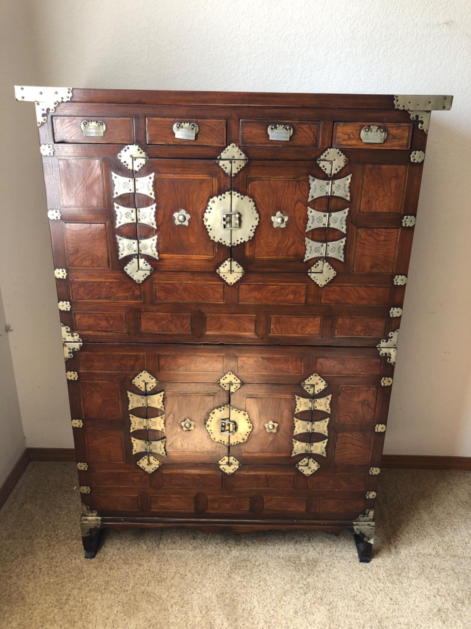 The Korean stacked clothing cabinet is made of elm wood with inlaid hardwood designs. It features brass hardware, adding a metallic contrast to the wooden texture. The top section includes a row of four small drawers, each with white metal plates featuring circular and geometric patterns. Below these drawers are two sets of opening doors, also adorned with similar white metal plates and brass hardware. The cabinet’s corners are reinforced with additional decorative metal pieces, and it stands on four short legs. Bidding on this lot is an agreement that: (1.) You will have 2 capable, able-bodied persons to lift and load at a minimum. (2.) You will bring a hand truck and/or any other tools needed to remove this item. If these steps are not followed your item will be forfeited and no refund given.