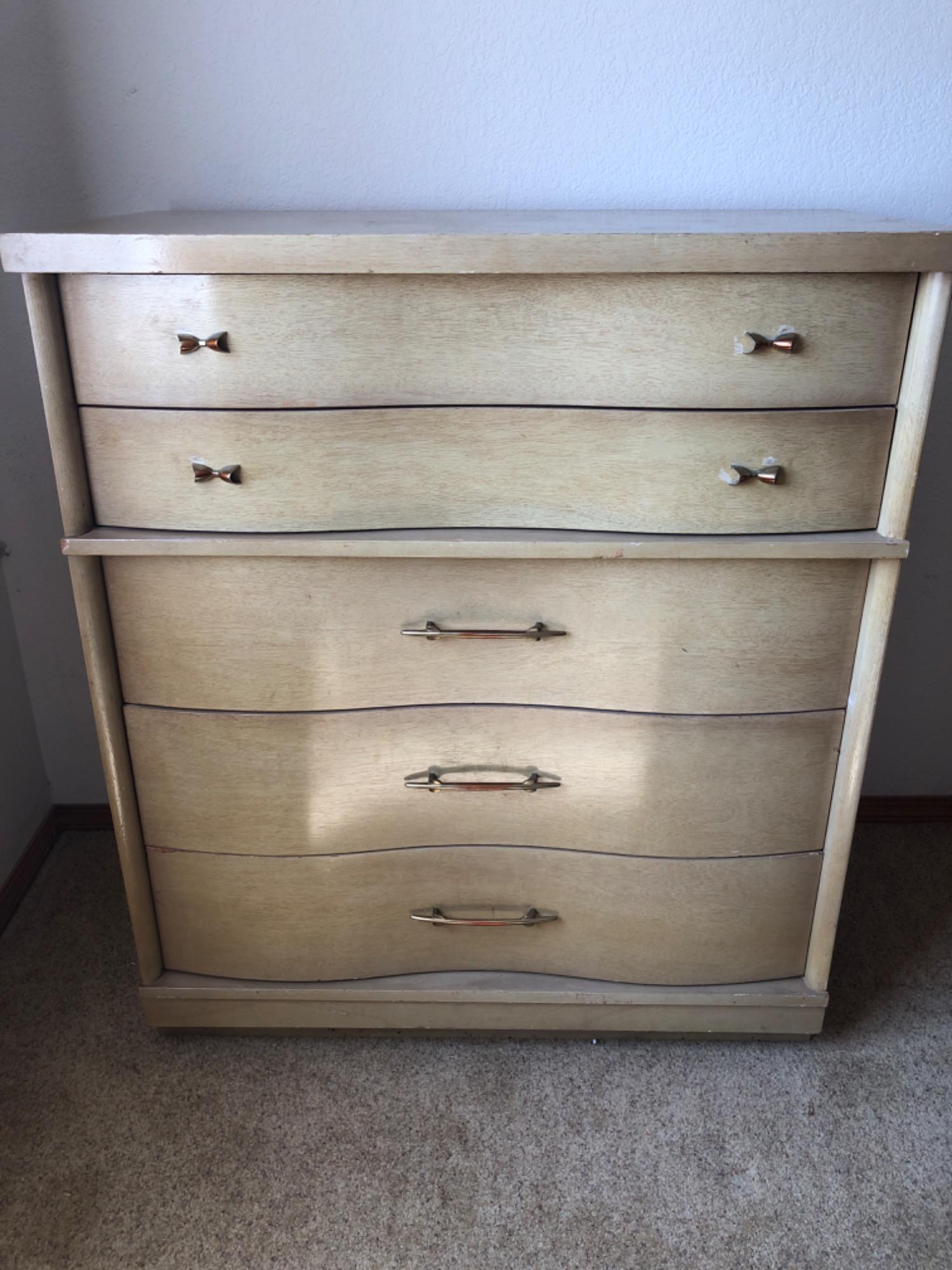 The dresser is made of blonde oak, which is known for its durability and attractive grain. There are minor surface scratches and slight discoloration, which are consistent with the dresser’s vintage status. The top edge has some visible dark marks or nicks, possibly from use over time. The knobs on the drawers are round, and the second drawer features a single long pull handle. All hardware appears original and adds to the piece’s authenticity. The construction seems solid, with no apparent structural damage, indicating that the dresser has been well-maintained. Bidding on this lot is an agreement that: (1.) You