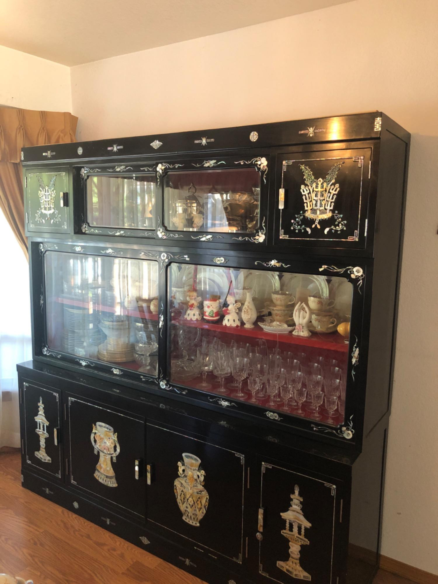 Black lacquer cabinet with glass display sections. It features intricate oriental motifs with mother-of-pearl or a similar material. The top section has three glass-fronted doors with shelves. The middle section has shelves with sliding doors. The bottom section has two solid doors and three drawers, all adorned with decorative handles and oriental scenes. Does not include any items in the cabinet Bidding on this lot is an agreement that: (1.) You