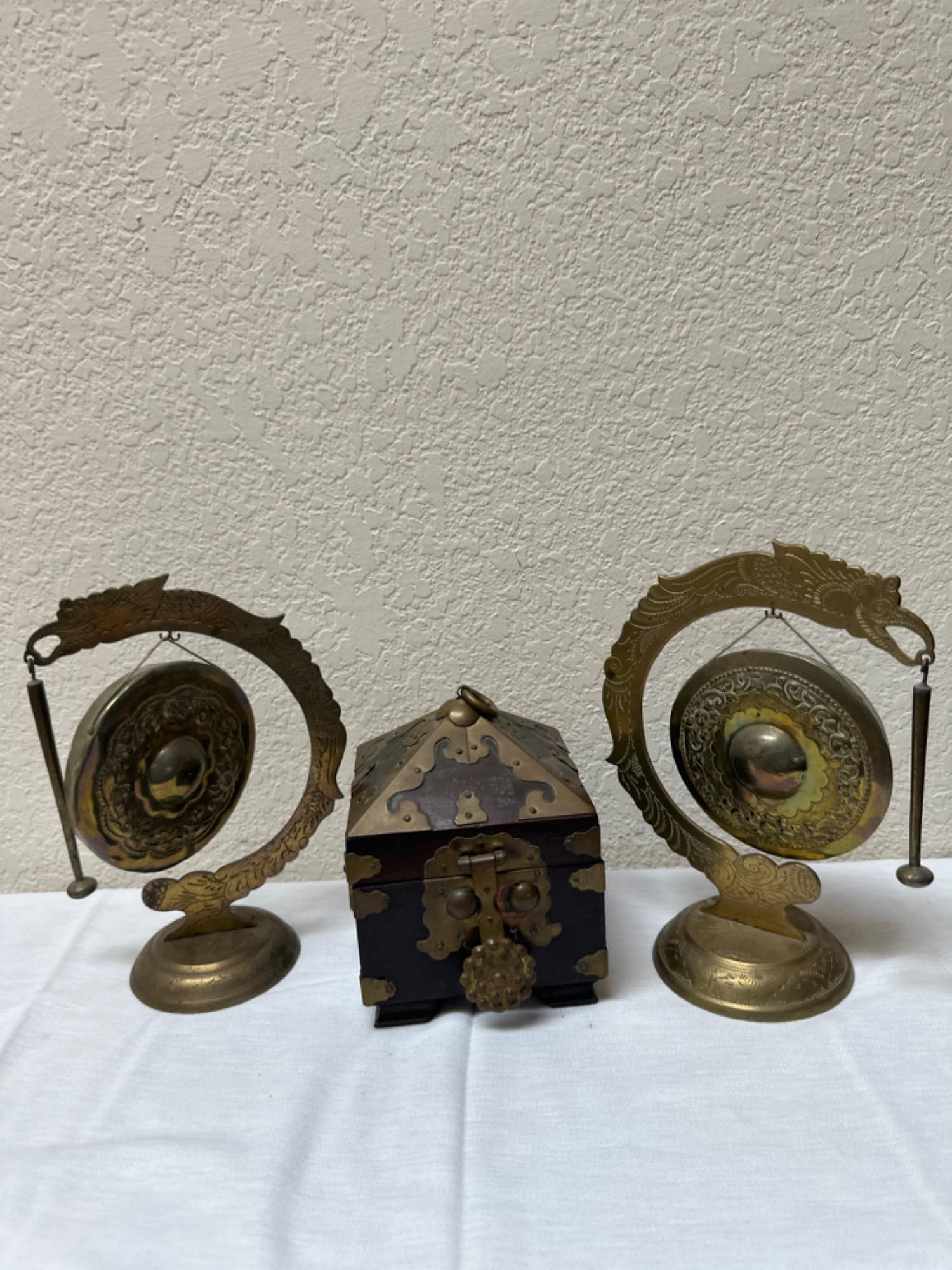 The image showcases three vintage Asian brass artifacts. A brass-clad trinket box adorned with intricate, possibly embossed designs and patterns. The box features a domed lid and a front latch, likely used for securing the contents. The darker accents highlight the detailed craftsmanship of the box. Flanking the trinket box are two brass dragon gongs. Each gong is suspended within a frame that resembles a stylized dragon, with elaborate details forming an arch over the gong. The gongs have a central convex section and are attached to their frames at the top, allowing them to swing slightly within these ornate holders. These items are primarily made of brass, a durable metal alloy known for its decorative appeal and resistance to tarnish.
