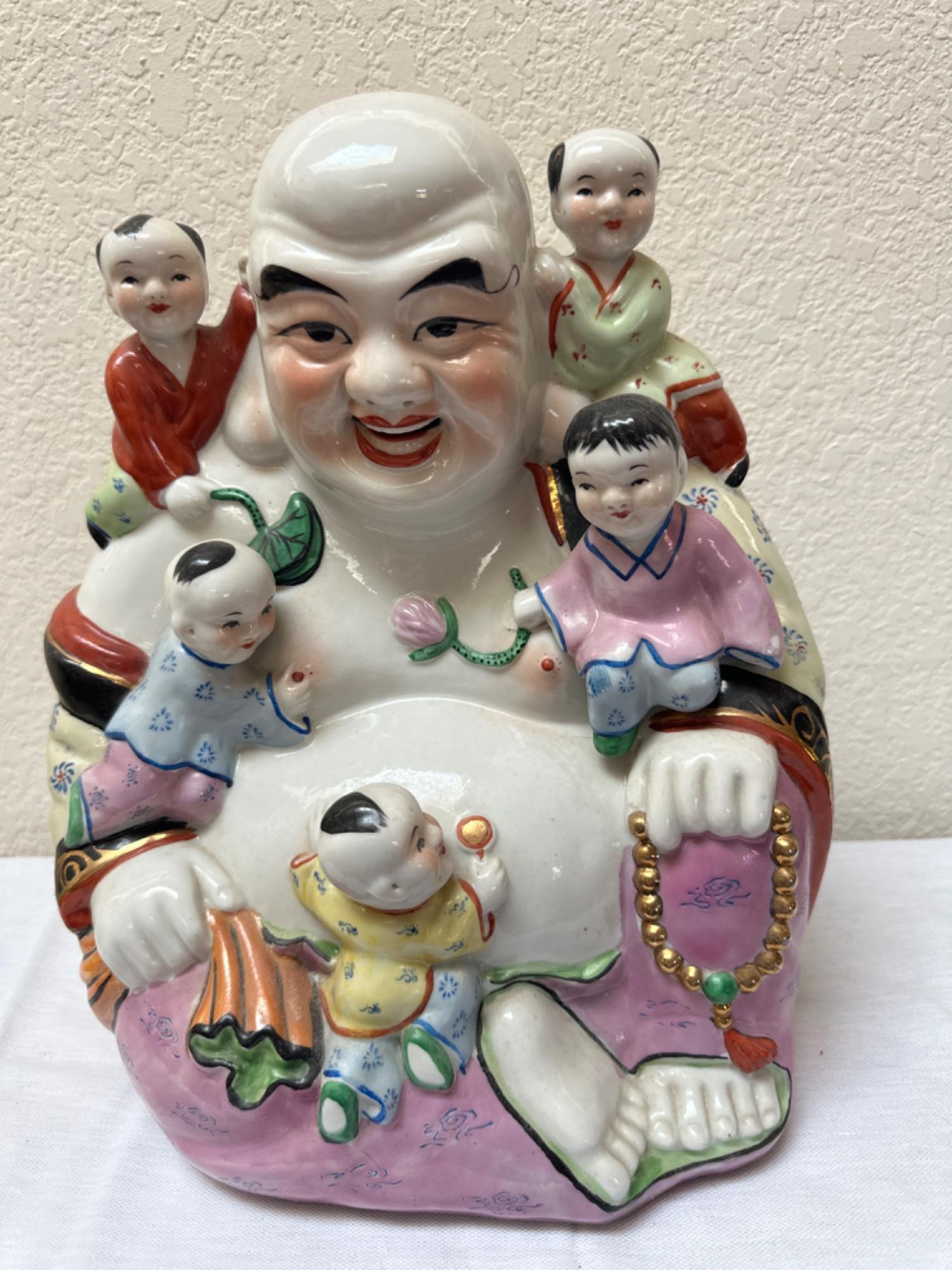 The statue is made of porcelain, known for its delicate yet durable quality. It is characterized by a multi-colored glaze typical of Famille Rose ceramics. The porcelain appears glossy, with pastel shades and other colors remaining vibrant. The figurine shows a high level of craftsmanship, with intricate designs and a joyful expression captured on the Buddha’s face, surrounded by playful children.
