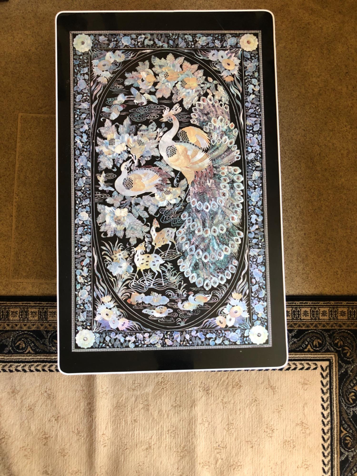 table features intricate designs of a peacock, bird, and deer fawn, showcasing