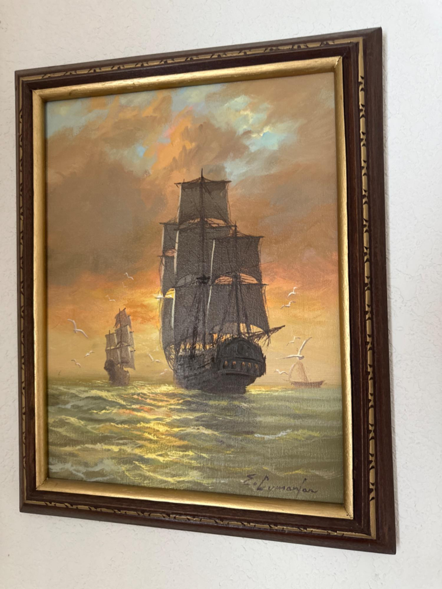 painting depicting a maritime scene with two sailing ships on the ocean. Wooden