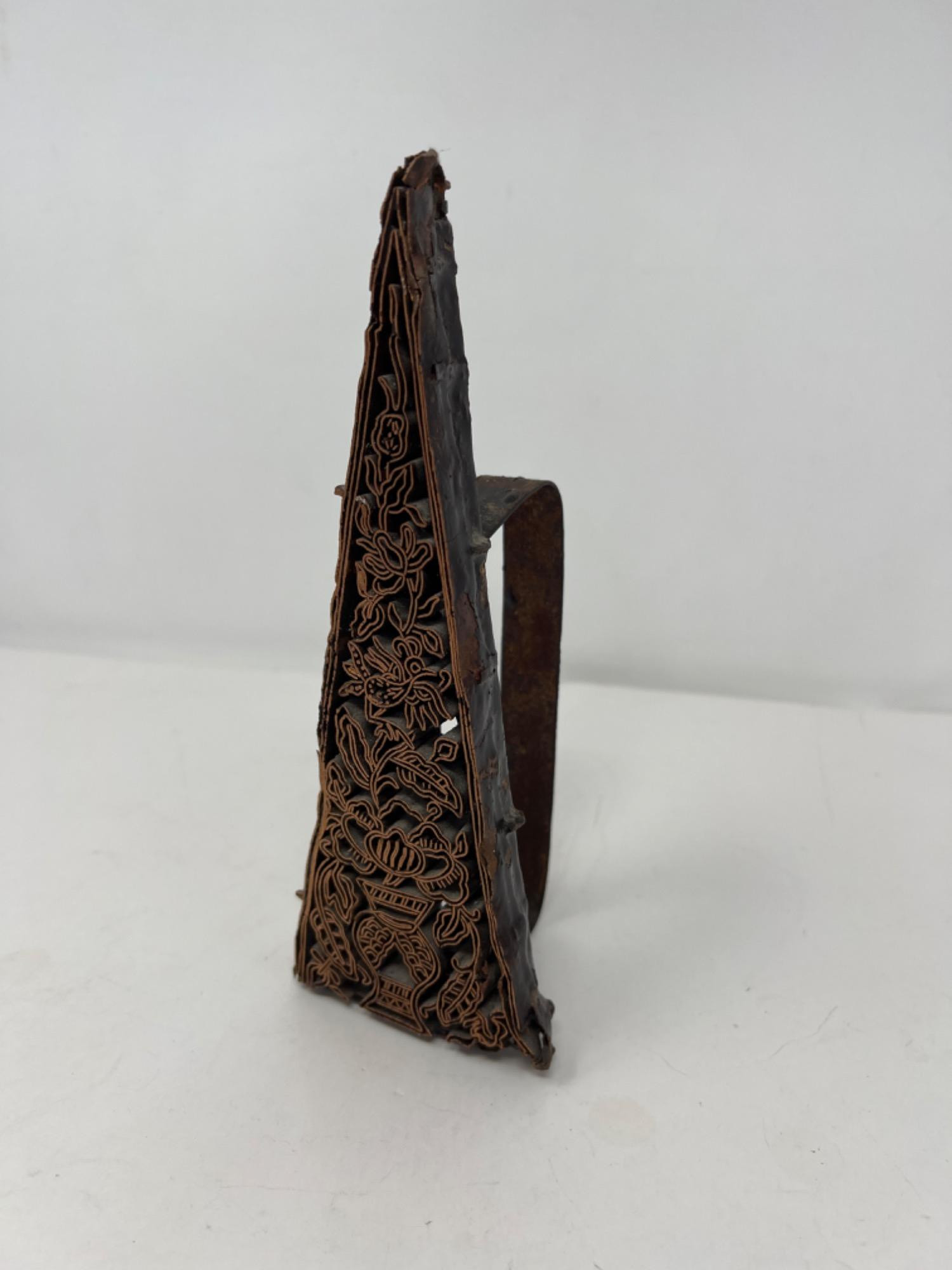 Tjap, pronounced "chop," is a batik fabric stamp created with thin strips of copper that are manipulated by hand into florals, geometrics, or other motifs. These beautiful motifs are then welded onto a metal base. This is a triangular shape with a floral and leaf design flowing from an ornate vase. Has the handle still intact.