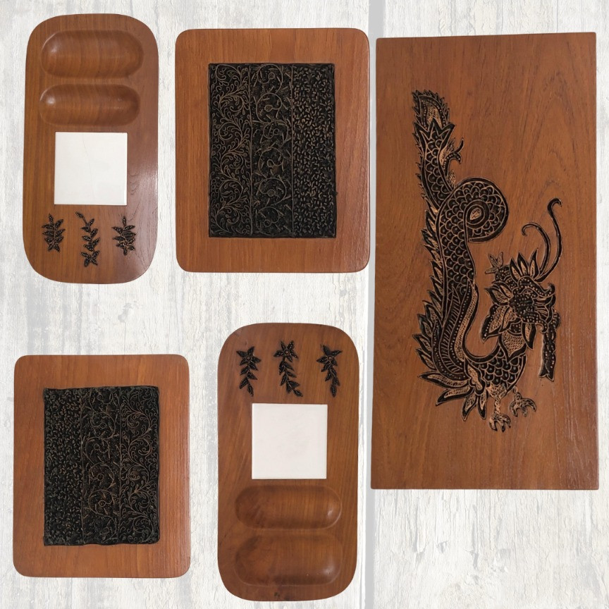 Set of five traditional Javanese Wayang Batik wooden stamps. Each stamp is intricately carved with metal copper designs inside the wood. Wood plaques and trays are of various sizes
