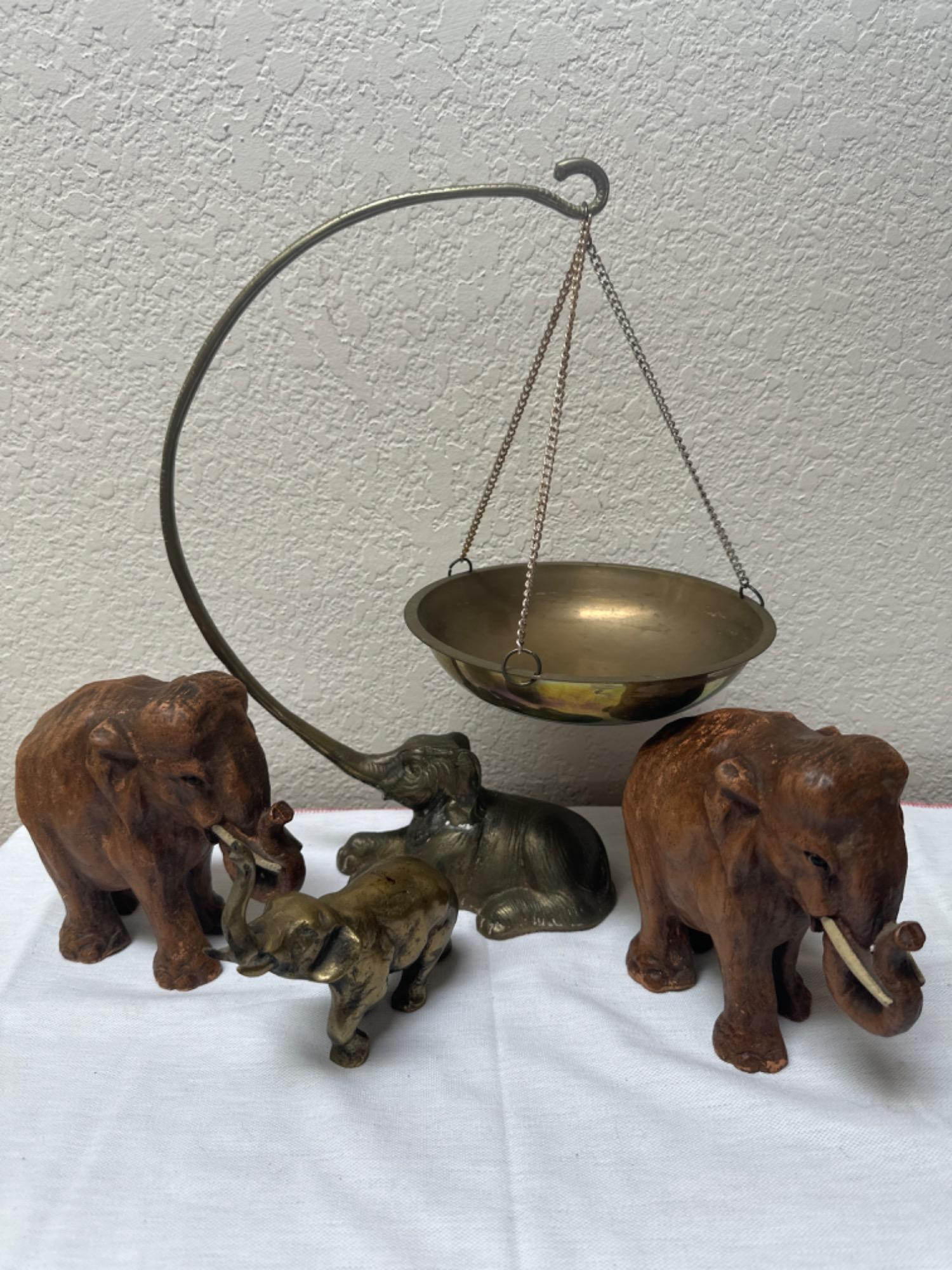 Brass Hanging Candy Dish, Singular Brass Elephant and Two More. Bras Elephant With Hanging brass dish - 13 x 12 Two elephants appear to faux material - 5 T x 6 W small solid brass elephant - 4 x 5