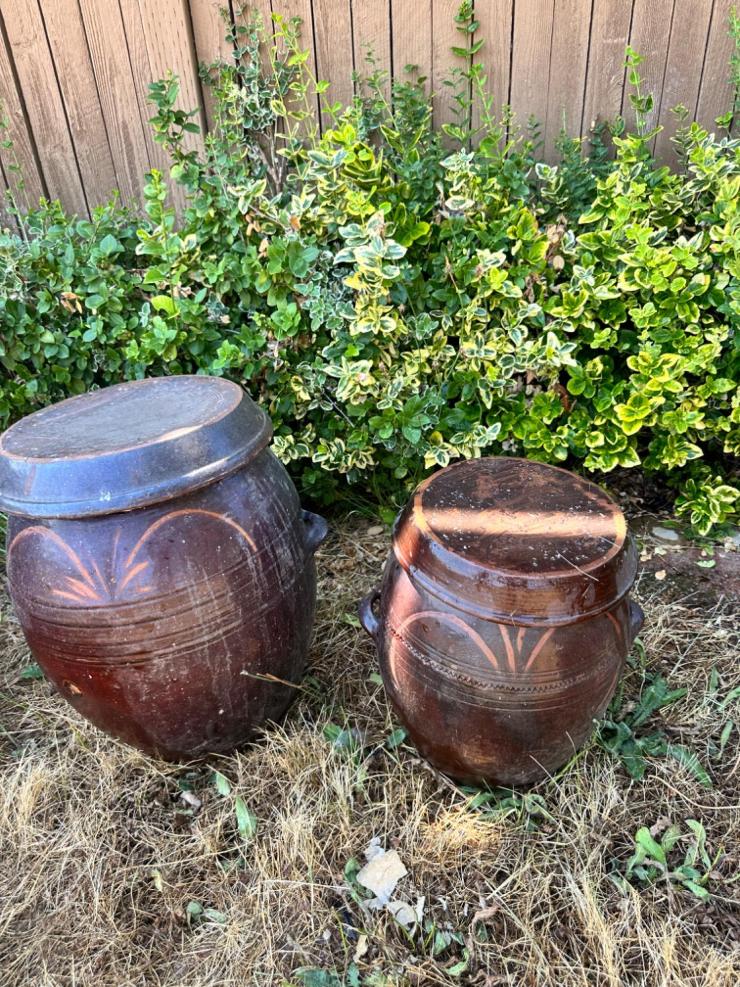 Two Vintage Stoneware Storage Jars including lids. Rare. 18" and 15" In height