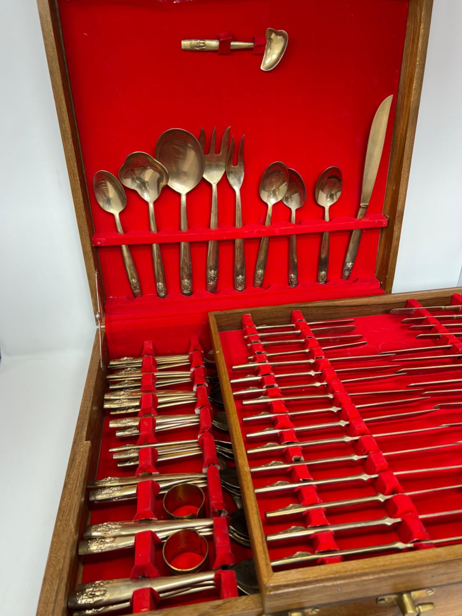 Brass flatware made in Thailand with elephant head design. 12 place settings plus serving pieces and brass napkin rings in wood case.