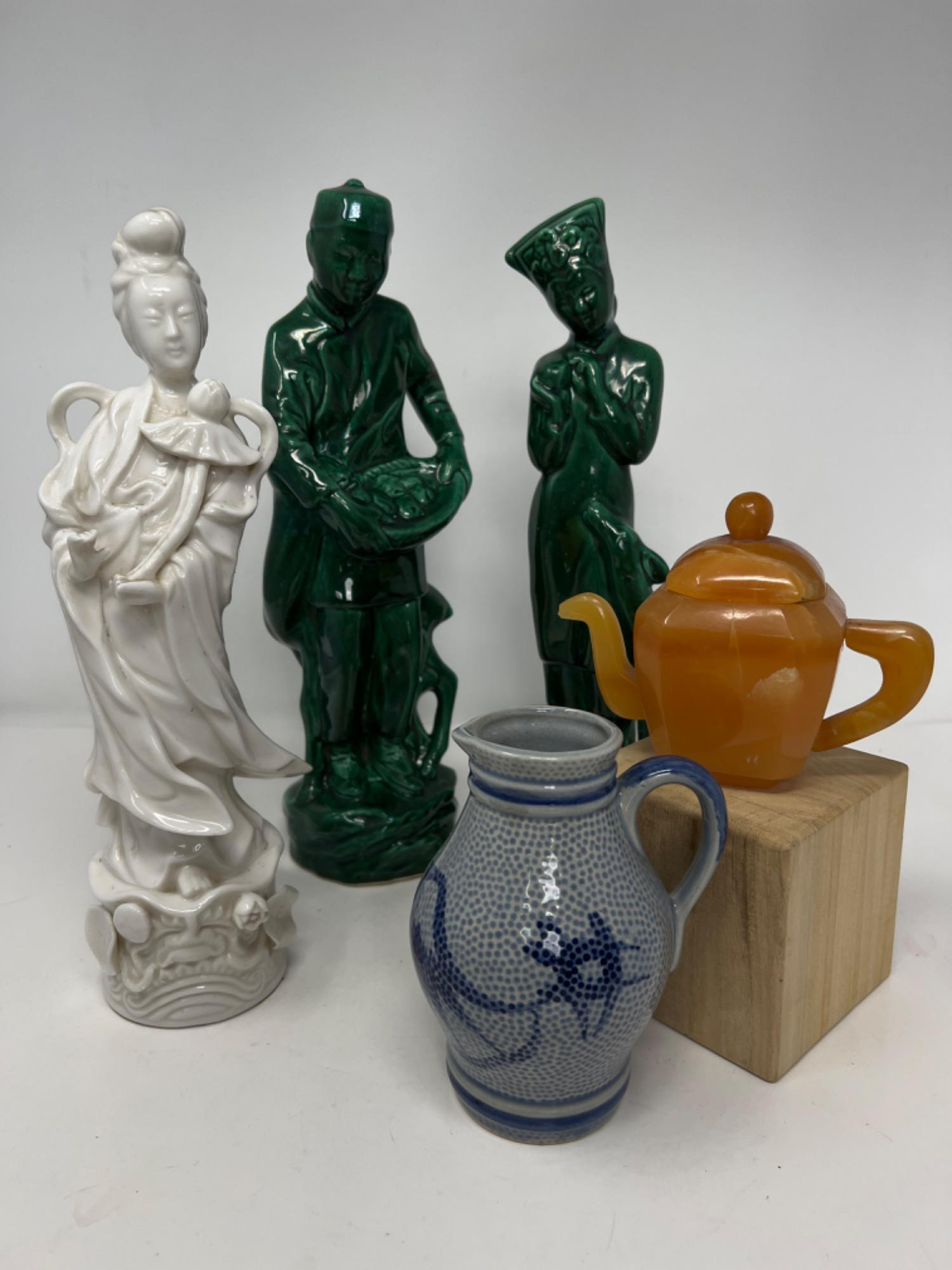 Figures are 12” tall. One figure appears to be repaired at feet (see pictures). Stone carved 4” teapot Asian mid century pottery 5” pitcher