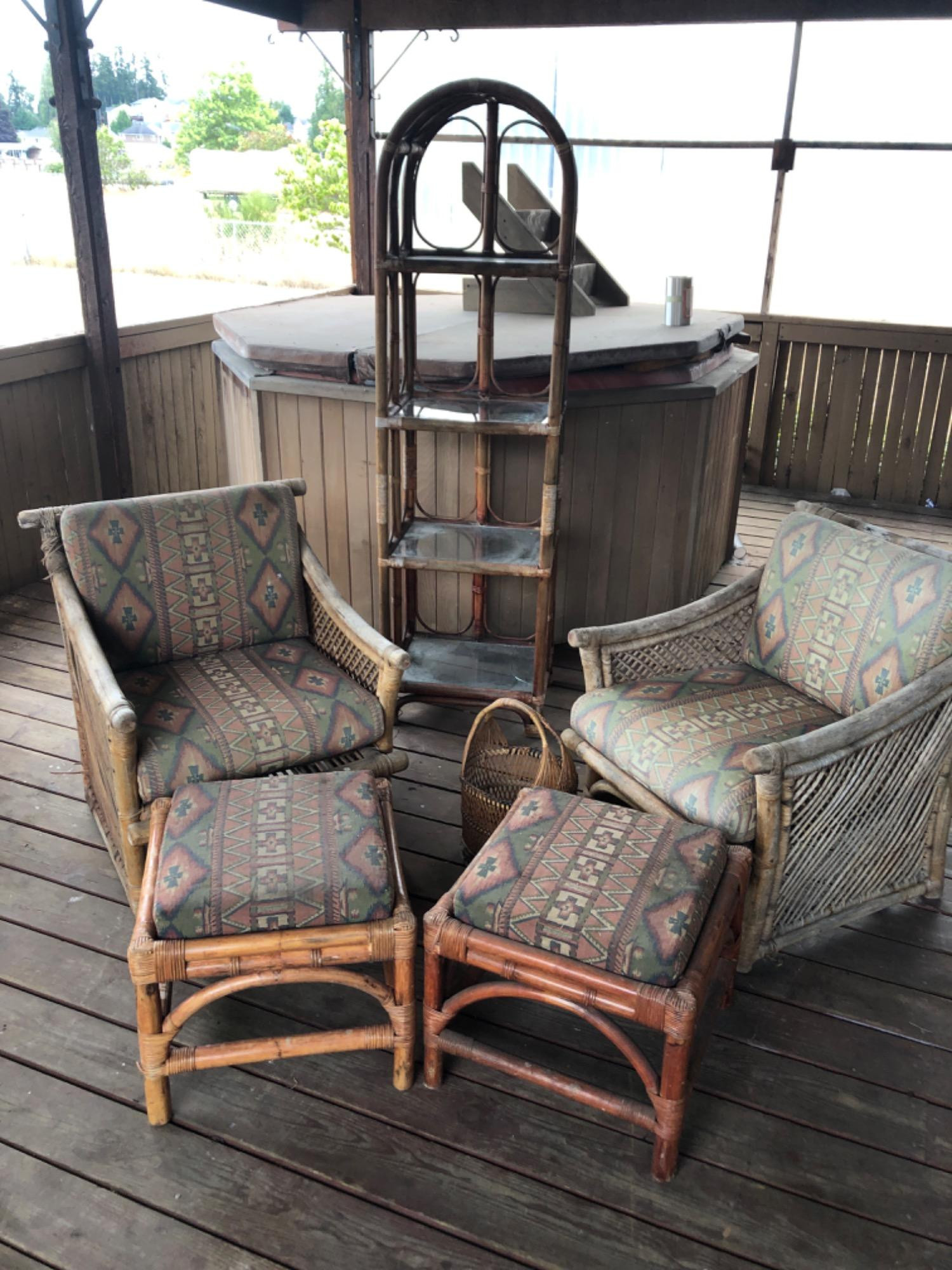 Lot Includes: Bohemian Display Shelf - 4 Shelves - Dimensions: 70 Inches high x 20 inches wide x 16 inches deep-One glass insert broken Pair of bohemian padded foot stools - Dimensions: 17 Inches high x 18 inches wide x 18 inches deep Pair of bohemian padded sitting chairs - Dimensions: Ground to top of seat 18 inches - Ground to top of the back 31 inches - Seat width 23 inches - Seat depth 18 Inches Please note- this is furniture that has been stored outdoor, it is weather faded, some rattan/wicker is coming unraveled and one glass insert is broken. Has good bones, just a little work. Very vintage and well built!