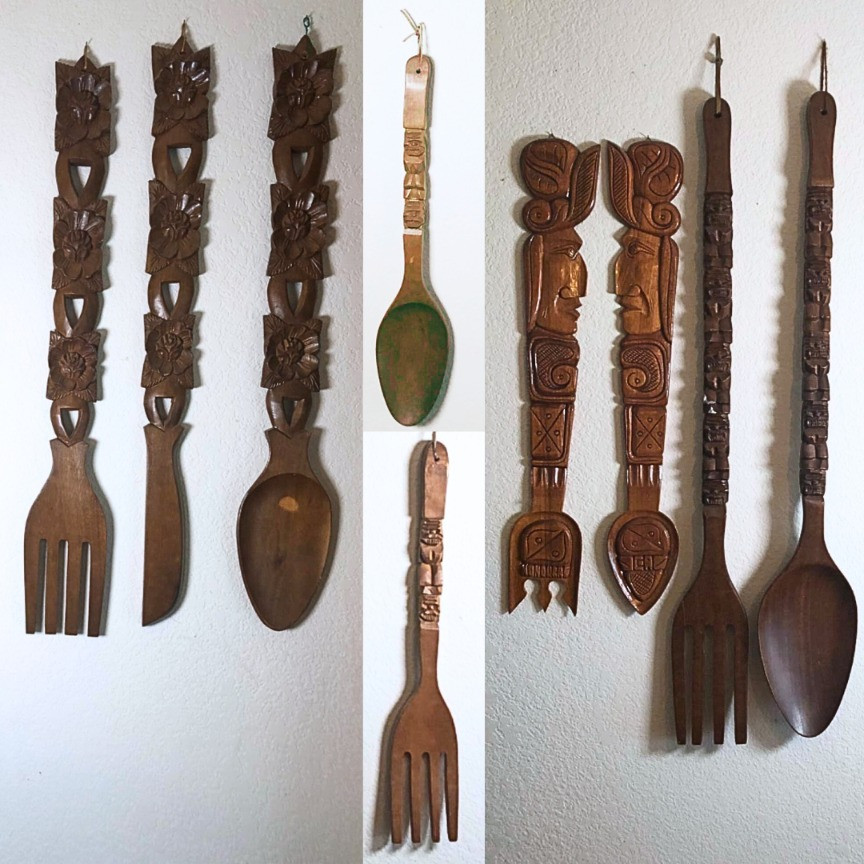 Central American and Indonesian Wood Carved Display Utensils - Total of 9 Intricately hand carved from different artist of Central America and Indonesia Sizes range from 41 inches long and 30 inches long and 22 inches long