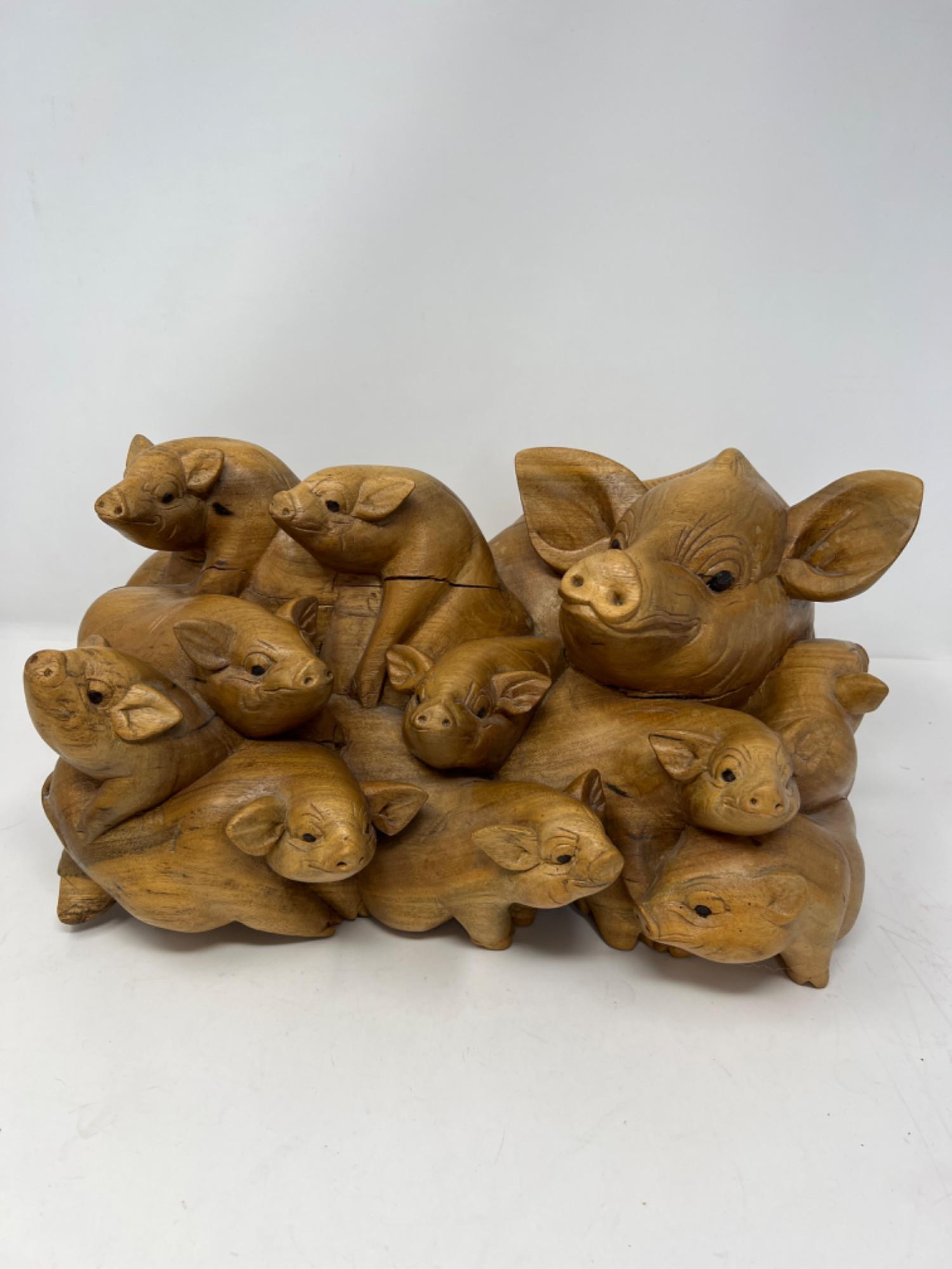 Vintage pig and piglets wood carved statue from Bali - 1979.