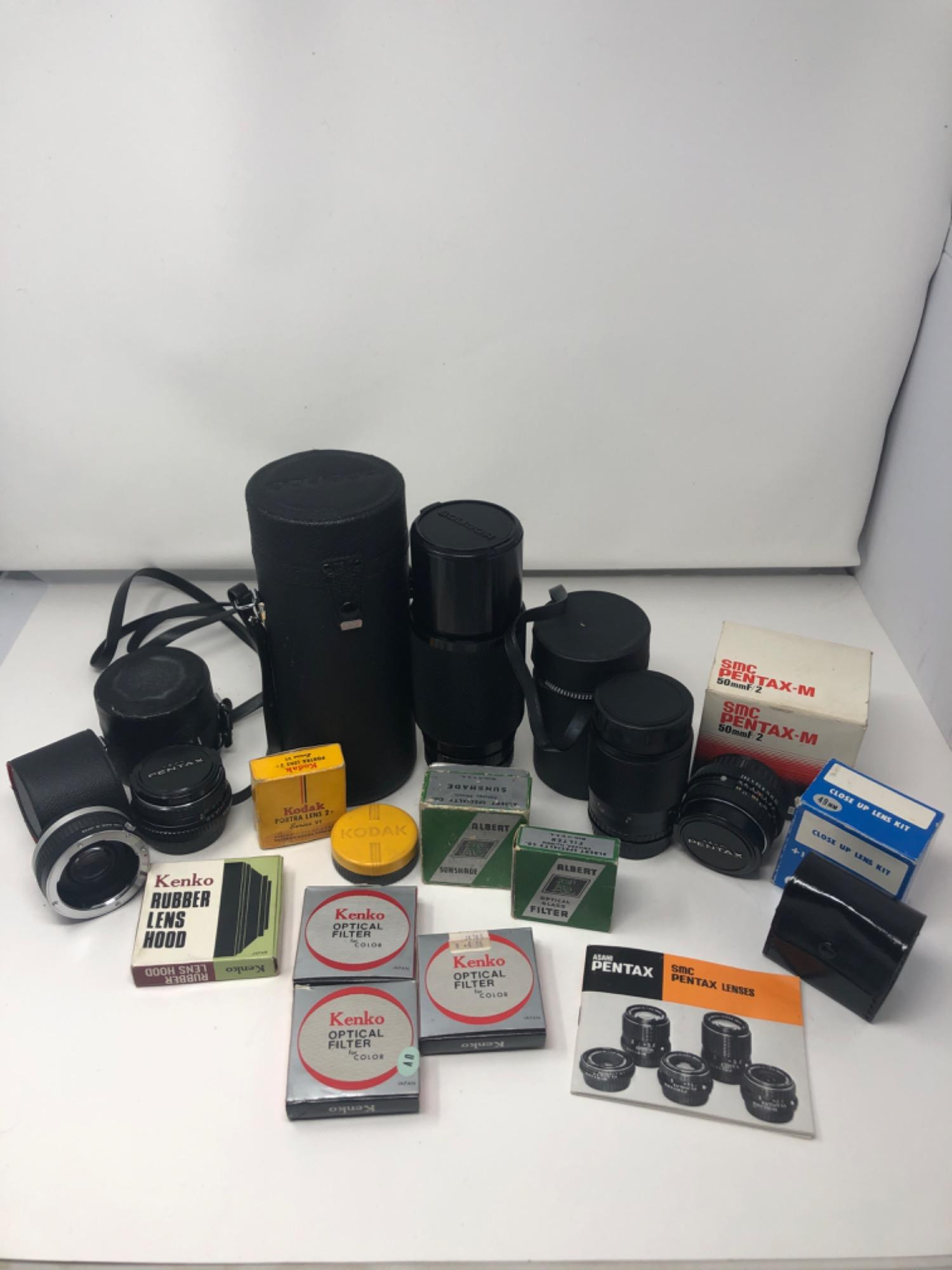 Lot Includes: Soligor 75-250mm / F4.5 Multicoated Zoom + Macro C/D Auto Lens - With Case Asahi Op. Co. Beck F = 135mm Lens - With Case SMC Pentax - M 50mm F/2 Lens Asahi Pentax - 28mm 1:2.8 Lens - With Case Calman Auto Tele Converter 2x For Pentax - K - With Case Close up Lens Kit +1, +2, +4 - With Case 3 Kenko Optical Filter for Color Albert Optical Glass Filter - Sunshade Series 2 Kenko Rubber Lens Hood 2 Kodak Porta Lens