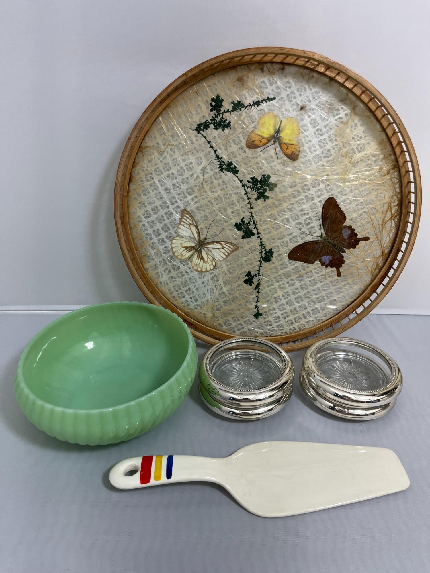 Lot # 42 - Sterling Coasters / Jadeite Bowl / MCM Butterfly Tray / Ceramic Server