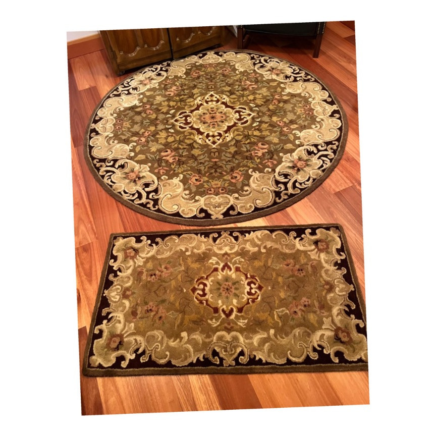 Two Hand Made Safavieh Oriental Wool Pile Rugs. Sage field, scrolled motif to complement, India, Safavieh Both in excellent condition. Round rug - 6’ diameter Rectangle rug - 27.5 x 49.5