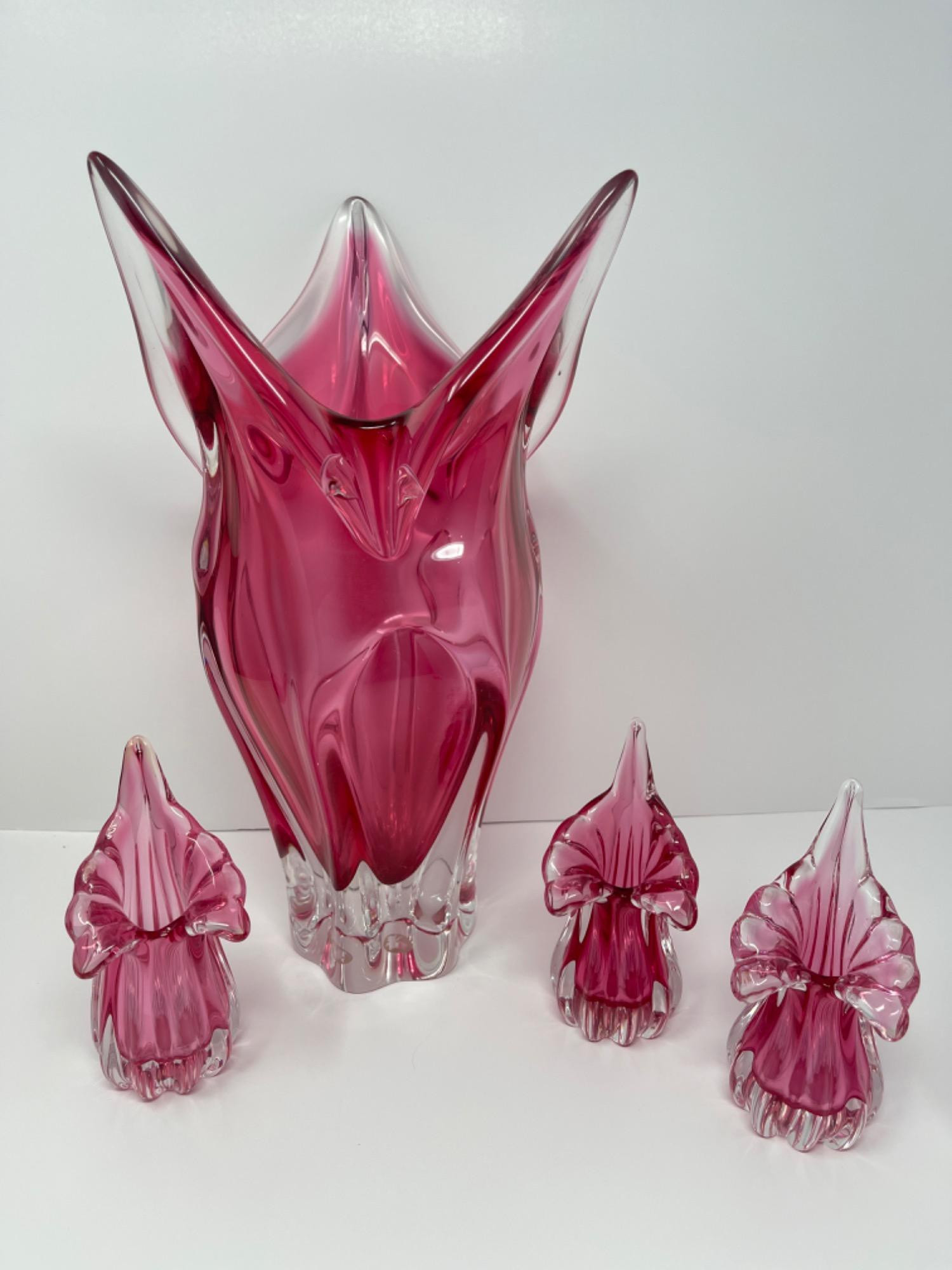 Bohemia Czech Large Pink Glass Vase and Three Smaller Vases. Bohemia Glass Czech Glass art vase. Marked 4414. Small imperfections, see photos. Three small vases that appear to match the larger vase, no marking on these vases. Measurements range- 5 - 13” H
