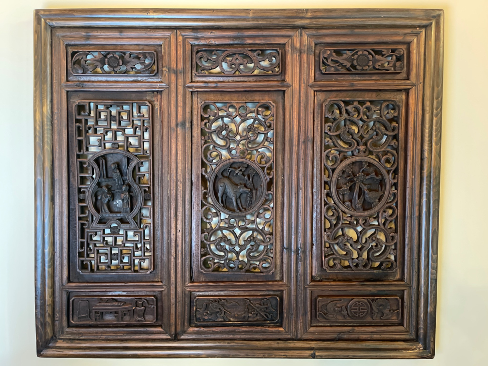 Architectural components, handcarved wood window screen, stated in receipts to be Qing Dynasty, ca. 1750 China. Intricate designs of fretwork with scenes with figures in medallions. Unidentified wood. Please note that there are some minor splits and signs of wear on the wood, which are consistent with its antique age. Measurements: 36 inches H x 43 inches W