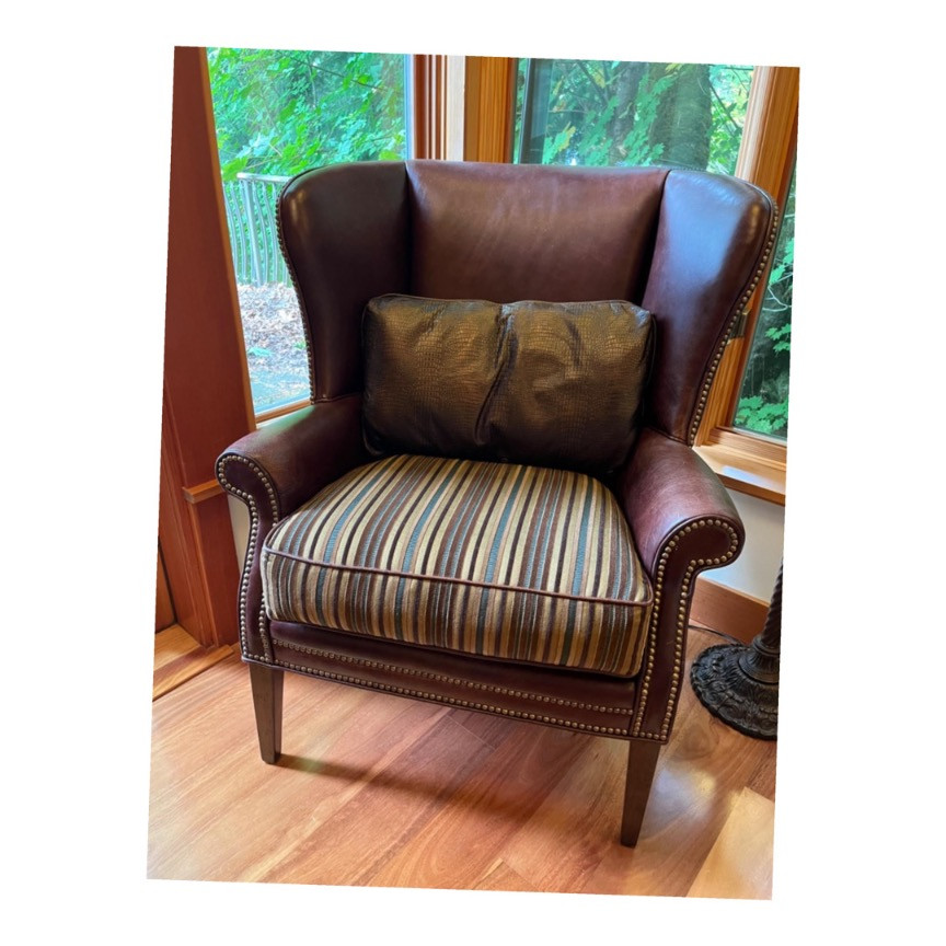 This Ferguson Copeland leather barrel wingback chair features a high, curved back and sides that form the distinctive “barrel” shape, providing an embracing seating experience. The chair is upholstered in rich brown leather, which is of high quality and well-maintained, giving it a luxurious feel. The seat cushion is adorned with a striped fabric in shades of brown, beige, and hints of blue or green, adding contrast and visual interest to the design. Along the contours of the chair’s arms and wings runs a line of nailhead trim—a classic decorative detail that adds texture and accentuates its elegant silhouette. The legs are wooden with a dark finish that complements the leather. Its design is reminiscent of traditional English wingback chairs, which date back to the late 1600s. These chairs were originally designed to be placed near fireplaces to protect from drafts while trapping heat from the fire—a practical yet stylish solution for cold English homes. This modern interpretation by Ferguson Copeland combines traditional elements with contemporary design, making it a timeless piece suitable for various interior styles.