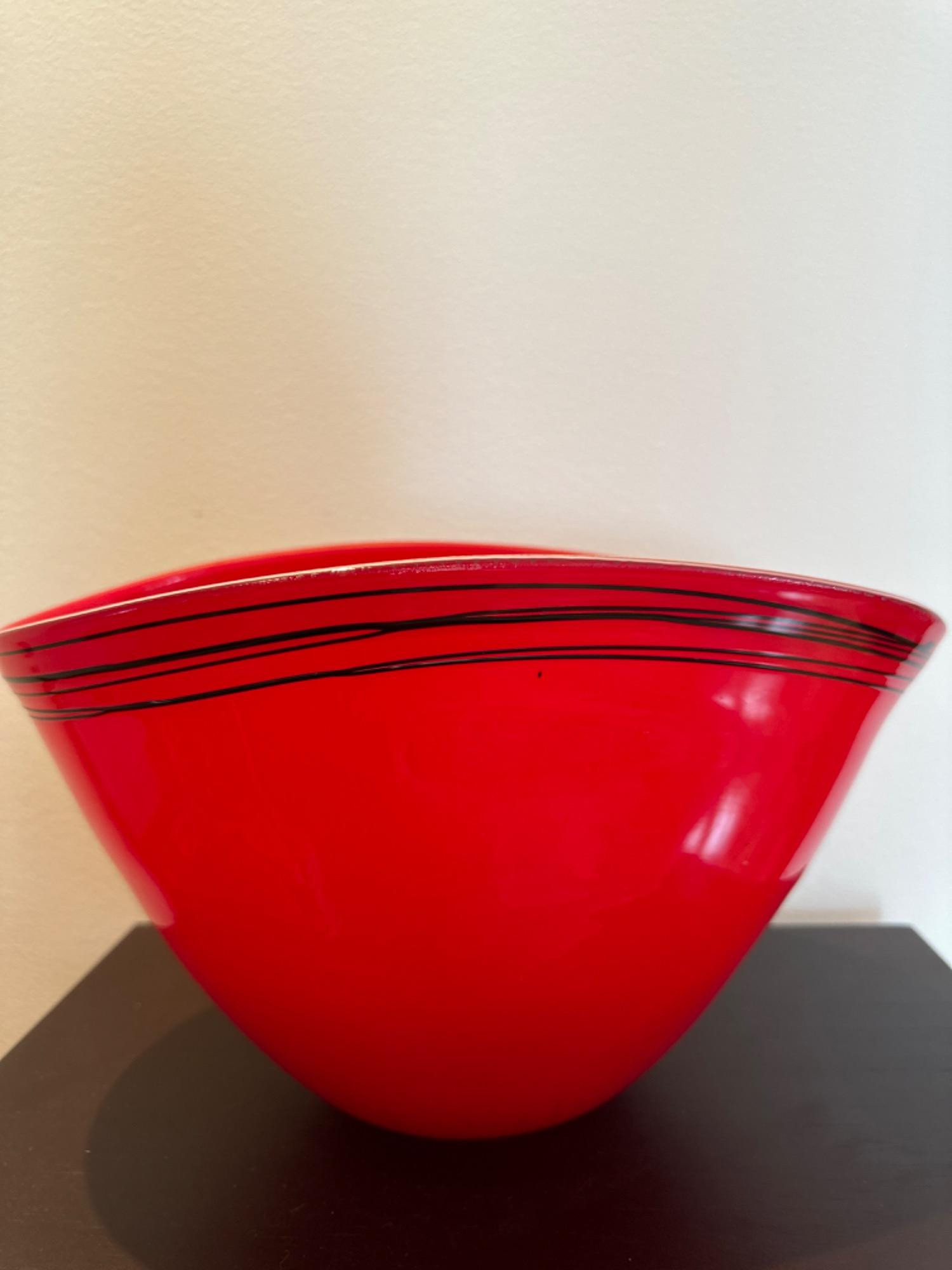 The Red Radiance Vase is a striking piece of art glass, characterized by its vibrant red color and glossy finish. The vase features a unique asymmetrical shape, with one side curving outward more prominently than the other, giving it a modern and artistic appearance. Near the top edge, several clear horizontal lines encircle the vase, adding to its decorative design. The material appears to be high-quality glass or a similar translucent substance, as light passes through it, illuminating its rich ruby color and enhancing its radiant aesthetic. Its contemporary design and craftsmanship suggest it could be a modern piece, possibly created by a skilled glass artist. The combination of its bold color and unique shape makes it a standout piece, likely to attract attention and admiration in any setting. Measurement: 8 x 12 W x 8 D