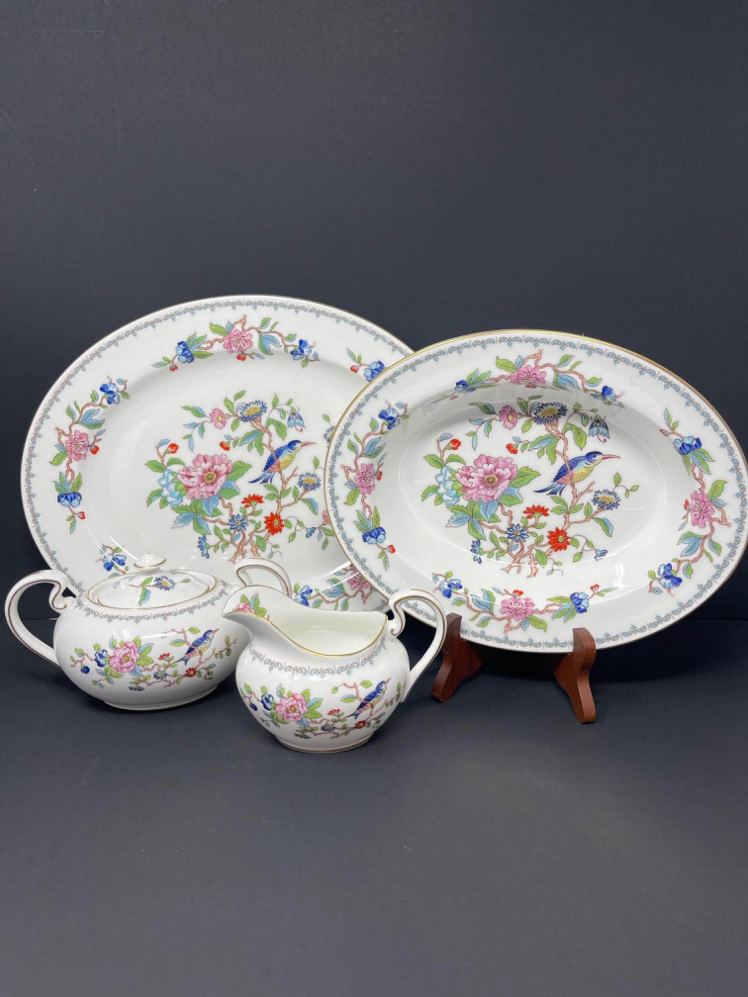 Two oval serving platters, one slightly shallow. Cream and lidded sugar bowl. The Aynsley England Pembroke Fine Bone China Set is a beautifully crafted collection of tableware that exemplifies the elegance and quality associated with Aynsley China. This set includes various pieces such as plates and a creamer, all adorned with the intricate Pembroke pattern. The design features a colorful array of flowers and birds, inspired by an 18th-century embroidery pattern. Each piece is made from fine bone china, a material known for its strength, translucency, and brilliant white color. This is achieved by adding calcified bone ash to the clay mixture, a technique perfected by Aynsley in the 19th century. Aynsley China was founded in 1775 by John Aynsley in Staffordshire, England. The company quickly became renowned for its high-quality bone china, which was favored by the British royal Family and other discerning costumers. The Pembroke pattern, in particular, has been a popular choice for its timeless beauty and intricate detailing. Measurement: Large platter: 13.5 inches wide