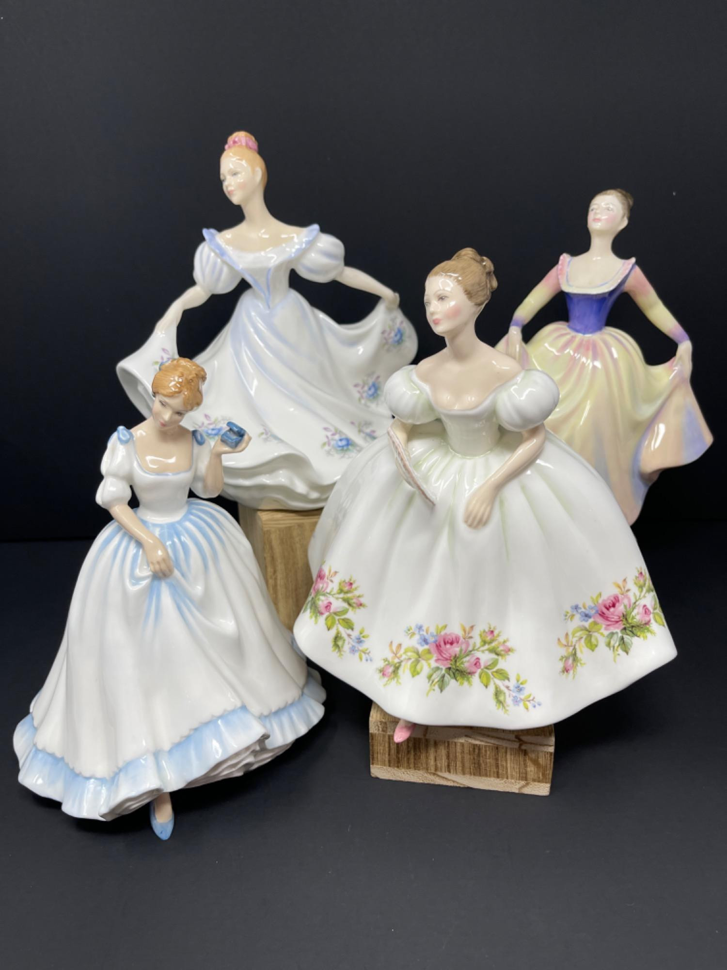 The image displays a collection of four Royal Doulton Porcelain Lady Figurines. Each figurine is intricately crafted with attention to detail, showcasing the classic elegance associated with Royal Doulton pieces. The figurines are made from porcelain, a type of ceramic material known for its strength and translucence. These particular figurines feature women in flowing gowns adorned with various embellishments such as flowers and ribbons, capturing the fashion of bygone eras. Each porcelain lady is posed differently, suggesting movement and grace. The faces are painted with fine features and gentle expressions. Royal Doulton figurines have a rich historical background; they have been produced by the Royal Doulton company since the late 19th century. Initially founded in 1815 as Doulton & Watts in London, England, the company gained a reputation for producing high-quality decorative stoneware. By 1882 they began producing ornamental figurines under the name Royal Doulton after receiving a royal warrant. Measurement: 7.5” - 8” tall