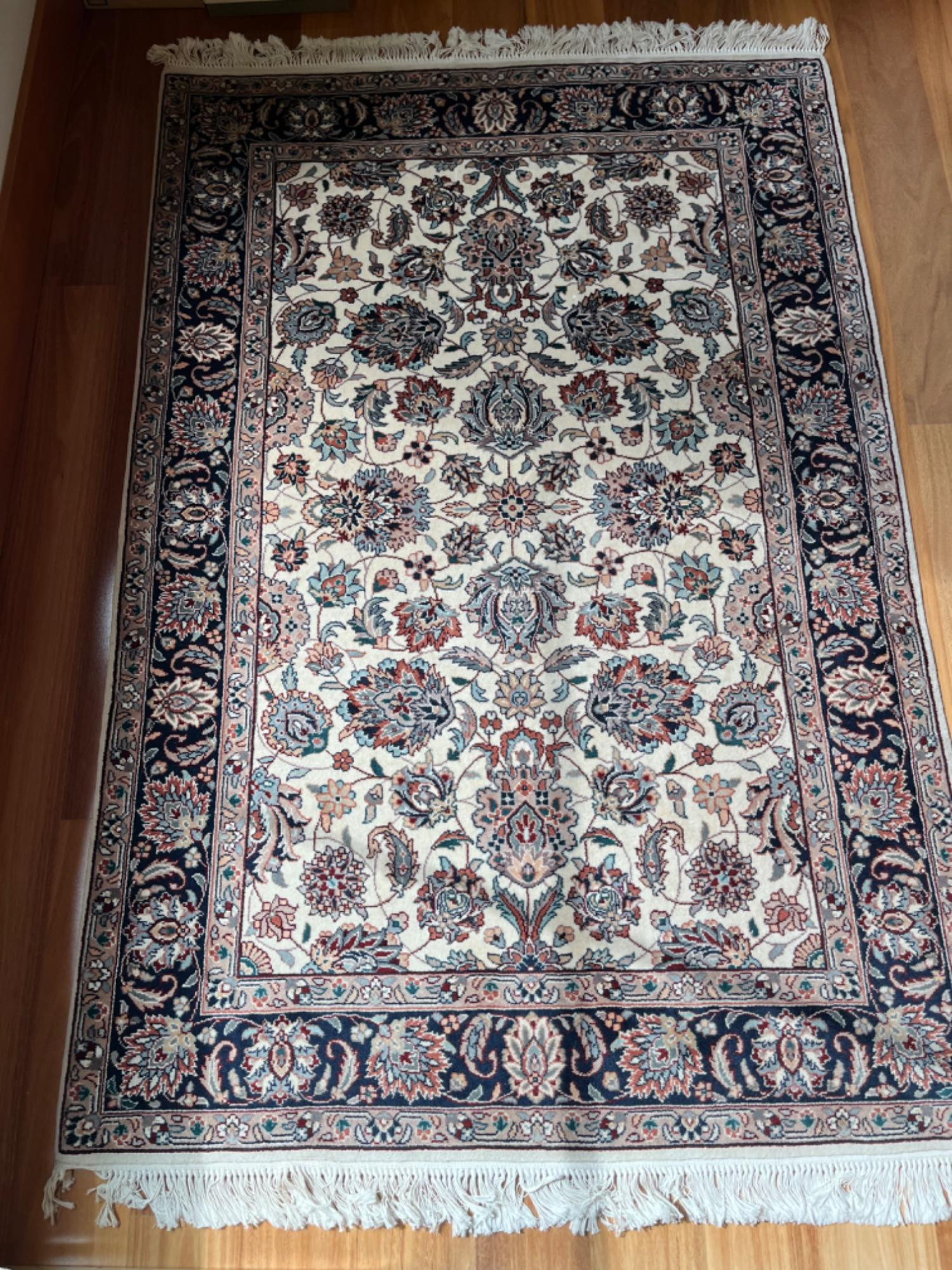 Hand Made Oriental Cream field Medallion 100% Wool Pile Rug. The item in the image is a rectangular wool pile rug featuring an intricate, symmetrical pattern with floral and foliate motifs in shades of blue, red, beige, and white. The central field is densely decorated with these motifs and is bordered by multiple frames with similar patterns on a smaller scale. This rug is made from 100% wool pile, known for its durability and warmth, often crafted from the soft undercoat of sheep’s wool. Wool pile rugs in general have a rich history dating back thousands of years, particularly in regions like ancient Persia (modern-day Iran). These rugs are celebrated for their beauty and craftsmanship, often considered valuable cultural artifacts. 4 x 6