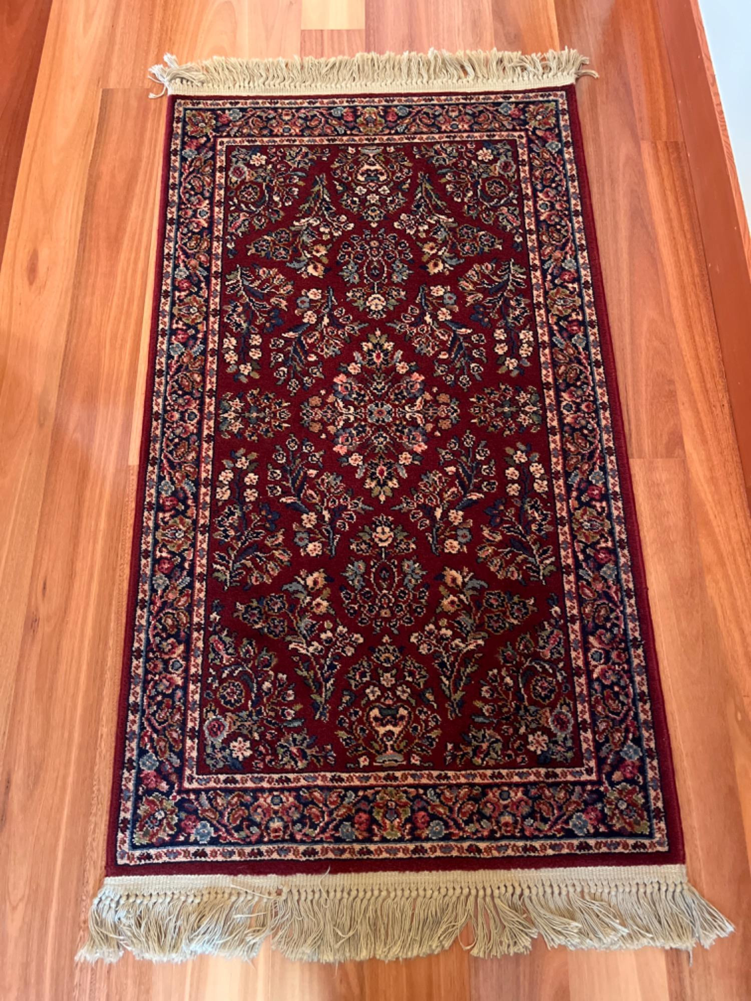 The item in the image is a Karastan Red Sarouk Wool Rug. It features a rich red field with intricate floral motifs and ornate border designs in contrasting colors such as navy, cream, and accents of green and gold. The rug is woven from wool, giving it a soft texture and durability. The fringe on either end adds to its traditional appearance. Karastan rugs are known for their high quality and are made using a power loom that replicates the hand-woven Oriental rugs’ knot-by-knot weaving process. The “Sarouk” style originates from the village of Saruk in Persia (modern-day Iran), famous for its densely knotted pile carpets with floral designs. This piece represents the broader historical craftsmanship of Persian rug making. Appraised at $800.