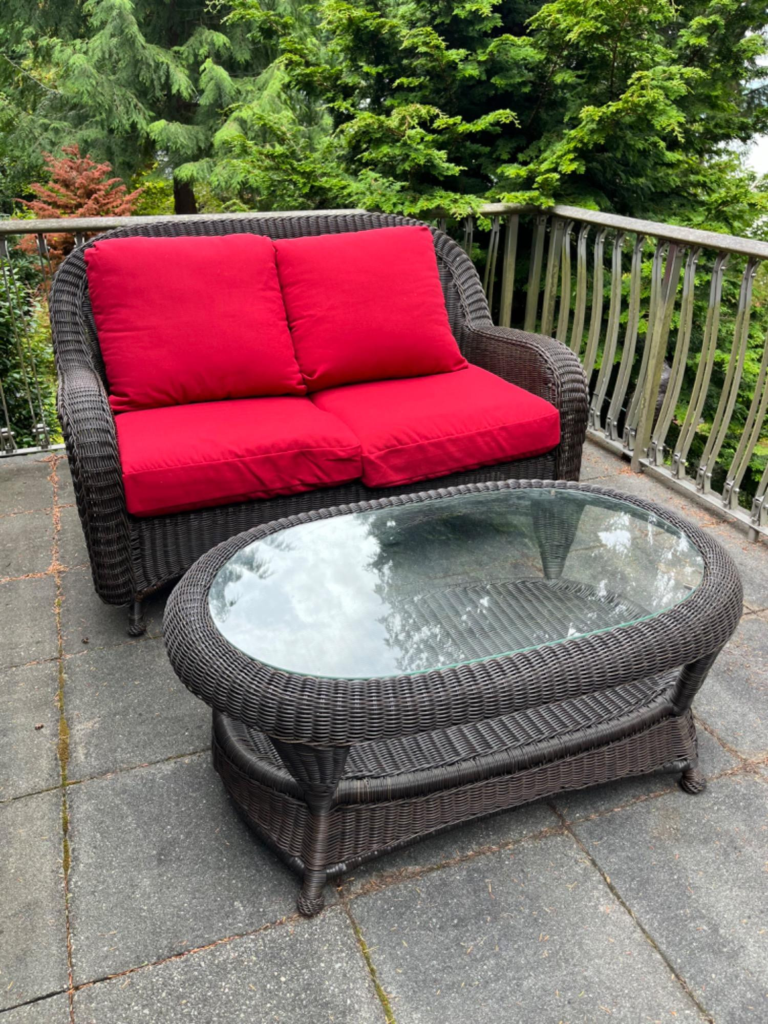The Wicker Patio Sofa & Coffee Table Set features a stylish and durable design. The sofa is constructed with a sturdy wicker base, known for its intricate weaving pattern and resilience. It is complemented by plush, vibrant red cushions that add a touch of elegance and comfort. The matching coffee table has an oval shape and is topped with a glass surface, making it both stable and easy to clean. Wicker furniture has been popular for centuries due to its lightweight and robust nature, often used in outdoor settings for its practicality and aesthetic appeal. Table is 18” h x 45” w x 29” d. Sofa is 37” h x 57” w x 34” d. Seat height is 19” h.