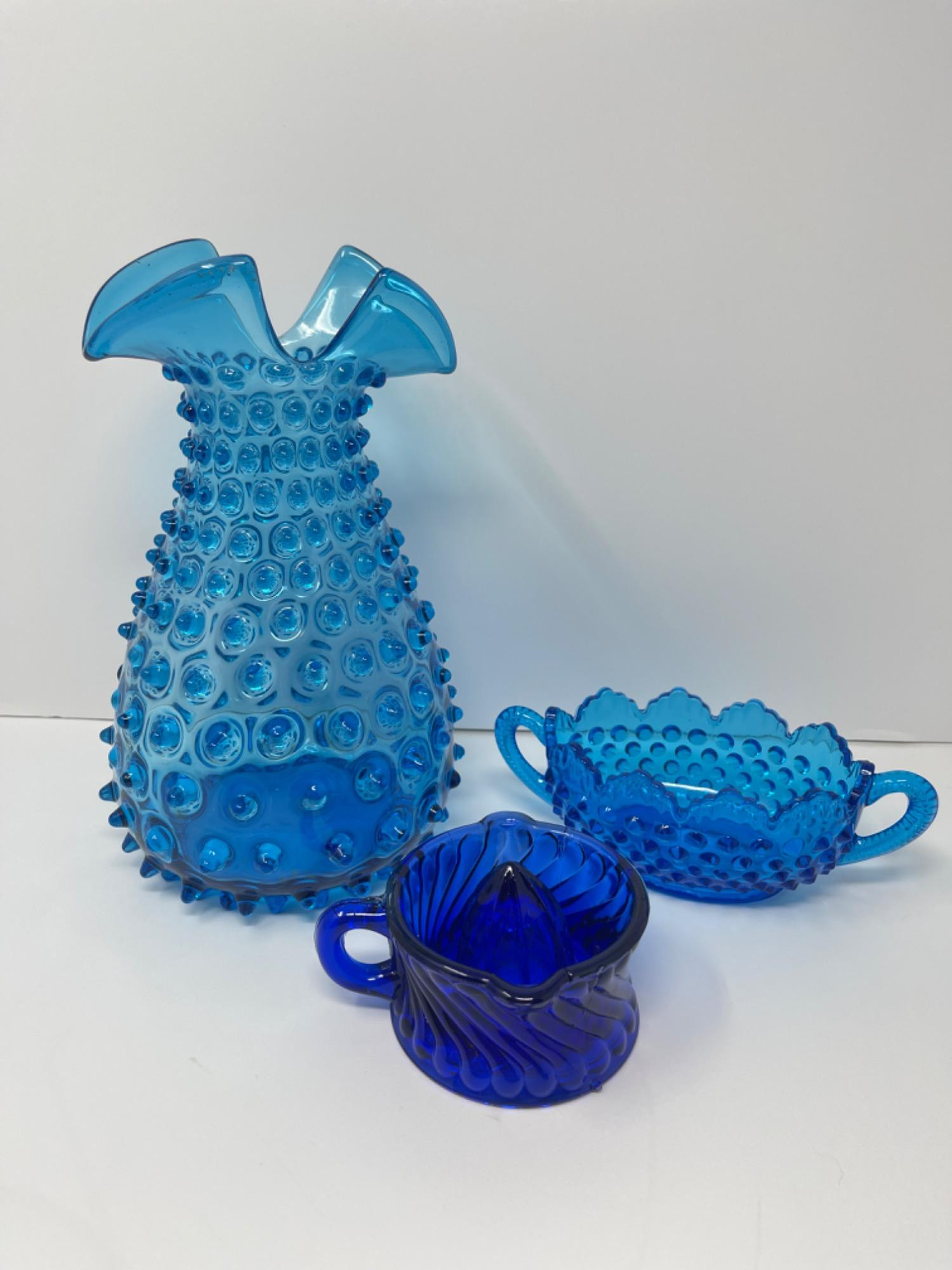 Blue Hobnail Split Rim Vase (9 inches): A 9-inch vase with a hobnail pattern and a split rim. Blue glass. Unique split rim design, vintage aesthetic. Cobalt Blue Glass Swirl Juicer Reamer with Handle: Juicer with a swirling pattern and handle. Cobalt blue glass. Functional kitchen tool with a decorative design. Vintage Fenton Hobnail Blue Glass Candy Dish with Scalloped Edge: Candy dish with hobnail texture and scalloped edges. Blue glass. Elegant design, collectible vintage piece. Shortest: 2 inches tall Tallest: 9.5 inches tall couple of small stains but no large chips or cracking