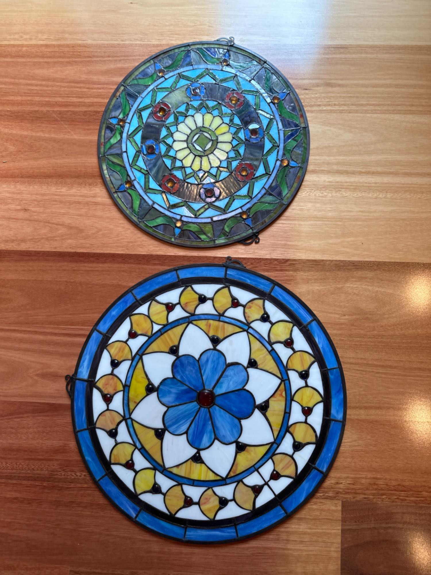Pair of Artisanal Stained Glass Window Hangings Circular shape with intricate patterns and vibrant colors. Colored glass segments held together by lead or copper foil.