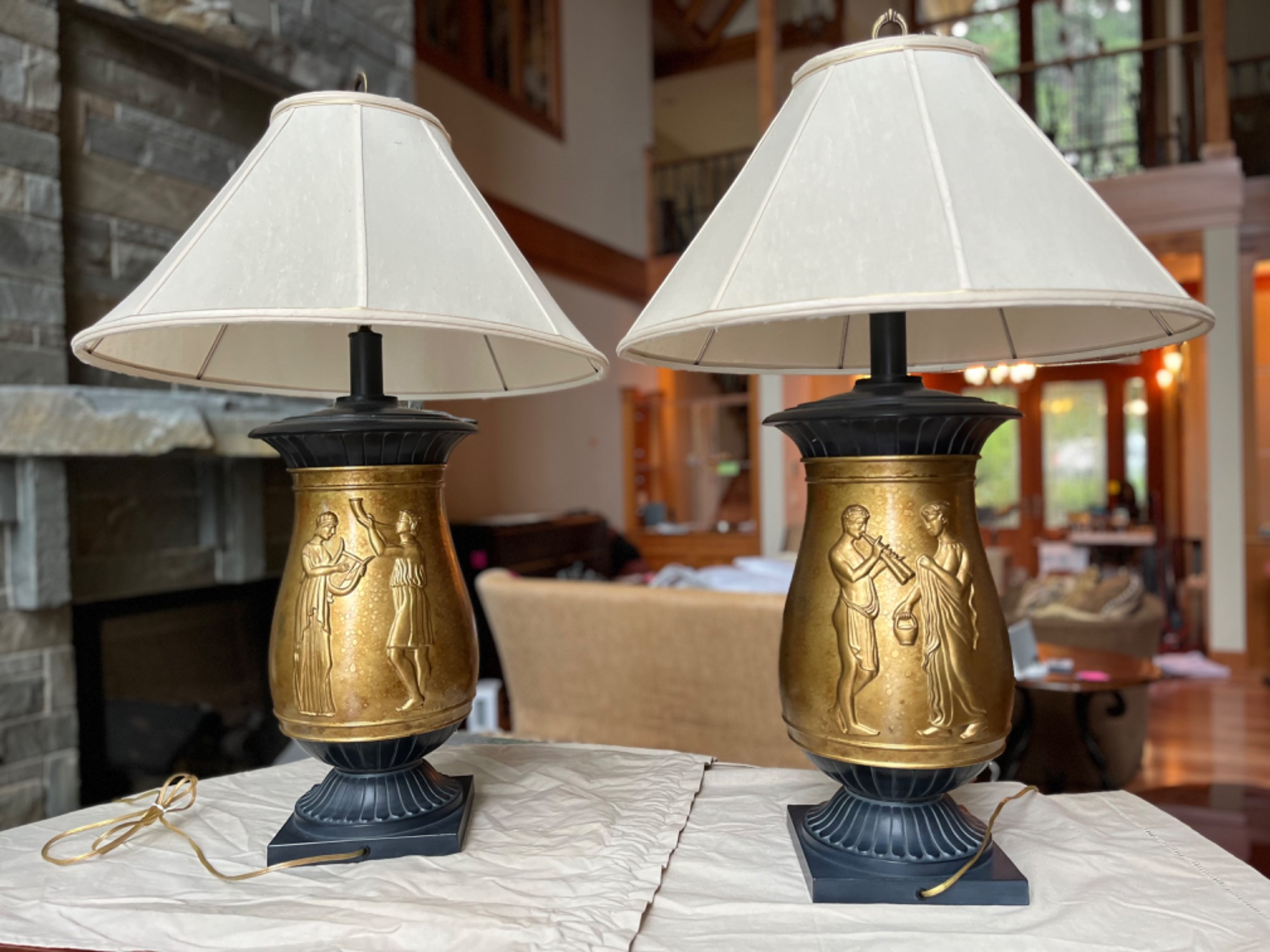 Table Lamps Classical with raised figural reliefs Metallic gold glaze Ceramic body, black base, off-white lampshade Decorative and functional Artistic and historical value Narrative figural motifs Heavy. No markings of maker