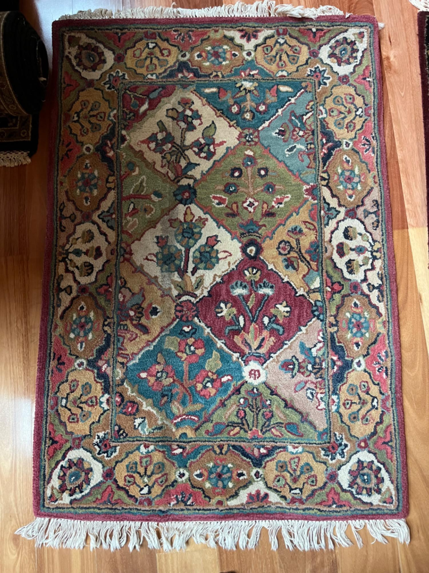 A hand-tufted wool carpet from India, featuring intricate floral and geometric designs. Reflects skilled craftsmanship. Made of 100% high-quality wool from India. Traditional patterns with vibrant colors. Represents Indian artistry.
