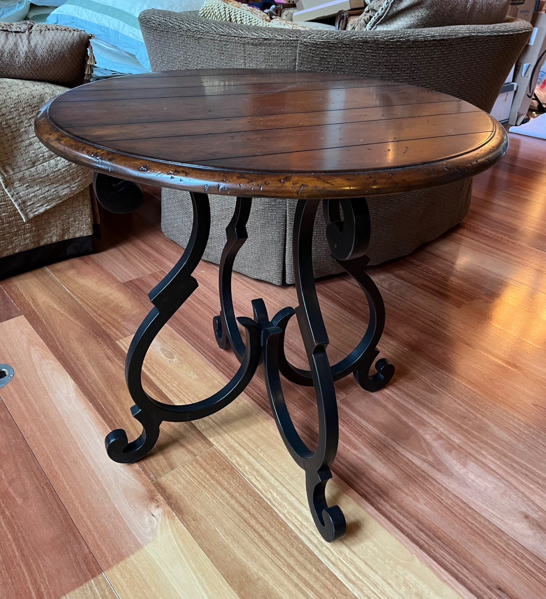 A side table from Woodbridge Furniture Co. featuring a circular wooden top and ornate metal legs. Circular top with visible wood grain and dark finish, curved metal legs with scrolled feet Branded Woodbridge Furniture Co.