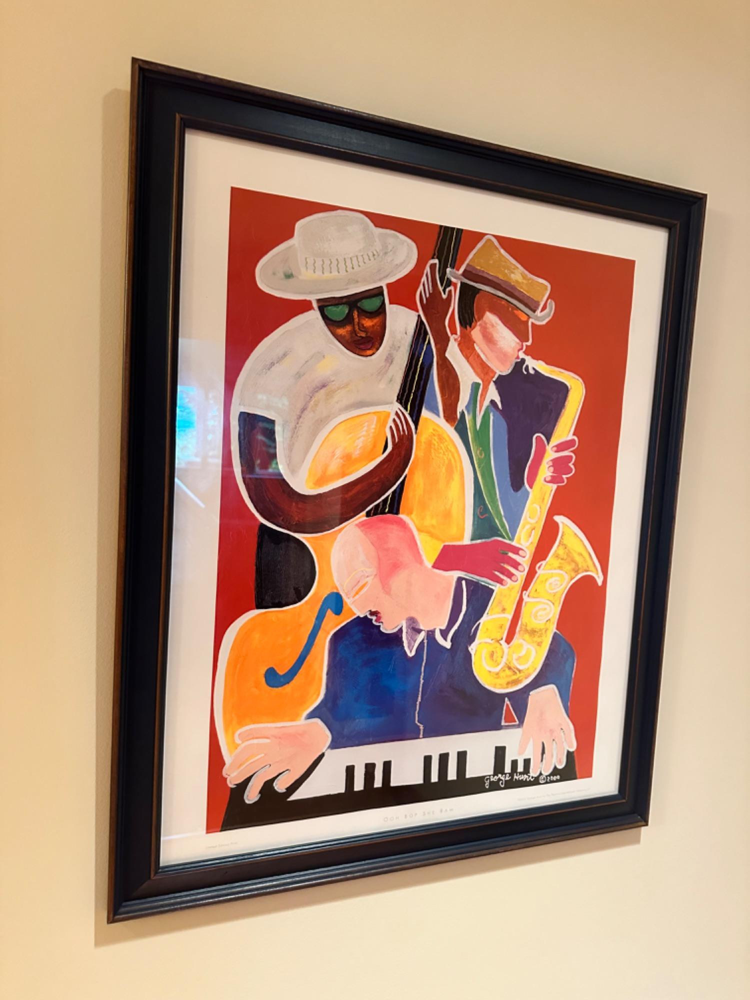 A framed artwork depicting three abstract musicians. "Ooh Bop She Bam" 2000 Abstract art featuring three musicians Vibrant color palette Expressive depiction of a jazz ensemble Paint on canvas