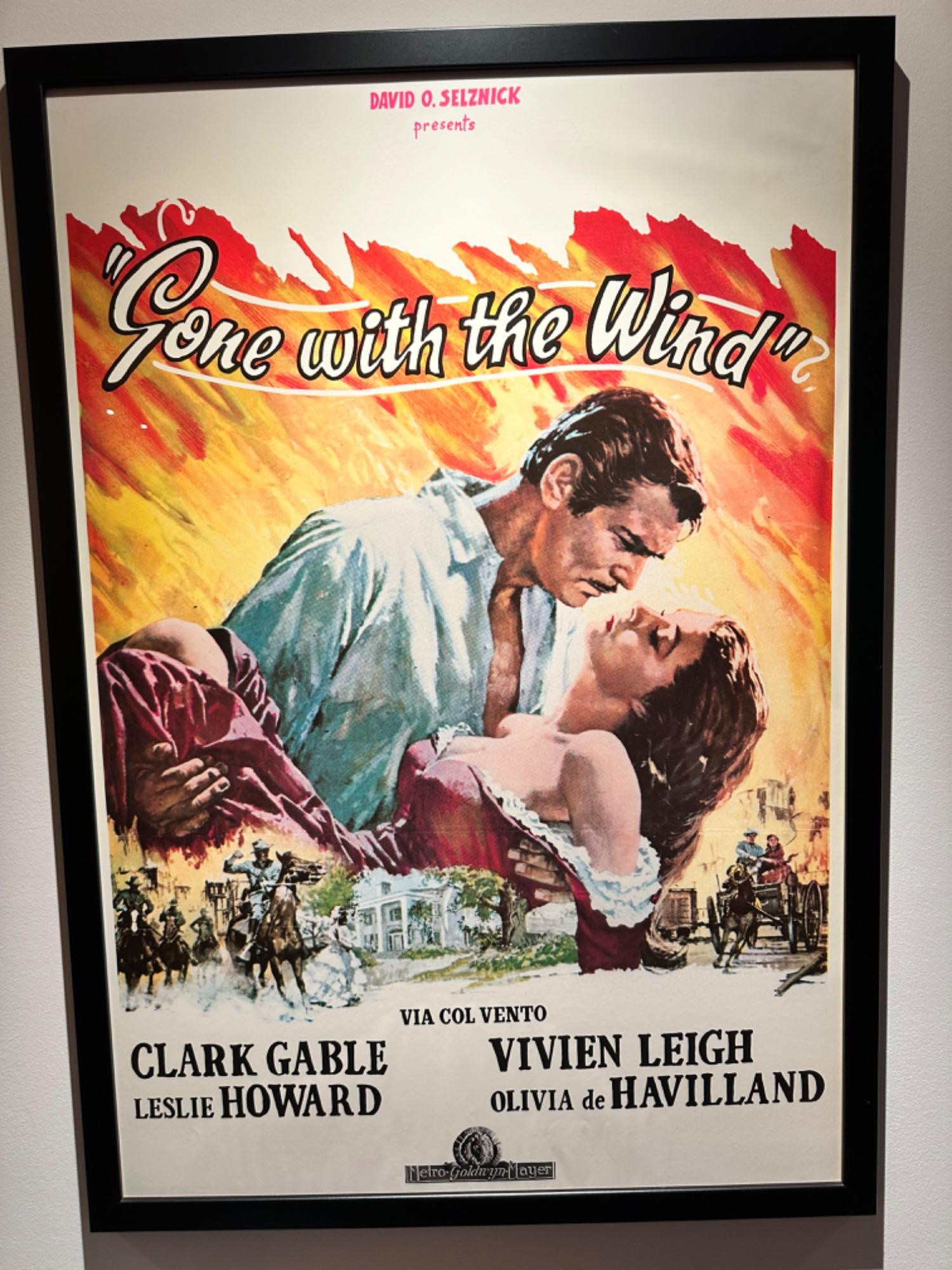 Italian movie poster for the film “Gone With The Wind.” Iconic artwork depicting a dramatic and romantic scene. Features names of notable actors: Clark Gable, Leslie Howard, Vivien Leigh, and Olivia de Havilland. Italian title: “Via Col Vento.” Made of paper, typical for promotional movie posters. Reproduction