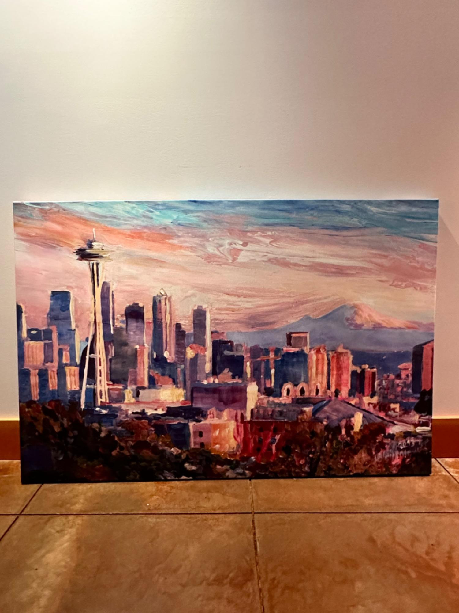 A large canvas painting featuring the Seattle skyline with the iconic Space Needle. Representation of Seattle’s urban landscape Vibrant and warm color tones depicting the sky Contrast between natural and man-made elements Approximately 32x48 inches Canvas, likely painted with acrylic or oil-based paints Seattle On Canvas-32x 48 W