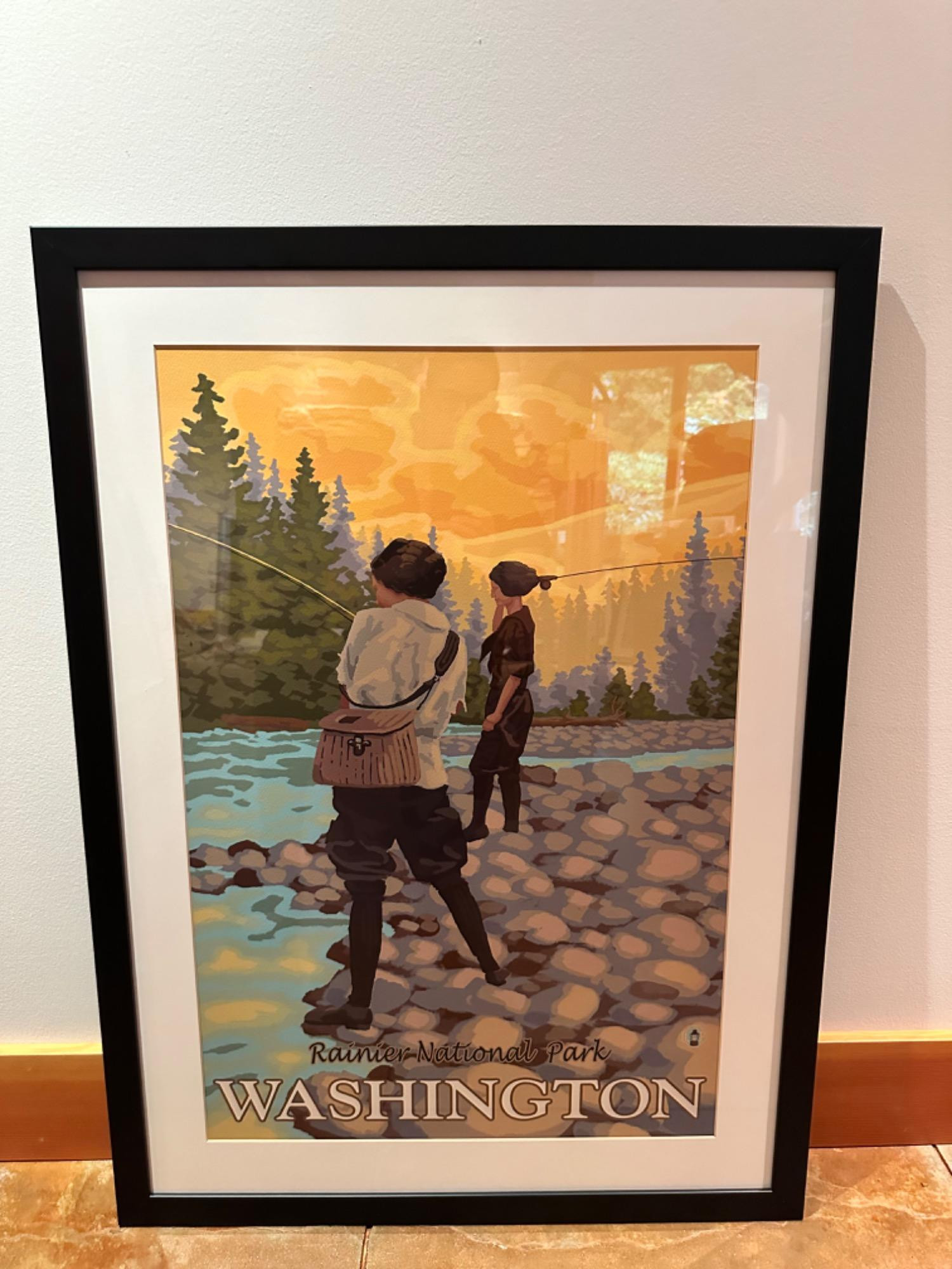 A framed decorative travel poster depicting fishing by a riverside in Rainier National Park, Washington. Features two individuals fishing by a riverside. Scenic backdrop of a forest during sunset or sunrise. Promotes tourism to Rainier National Park. Printed on paper or cardstock.