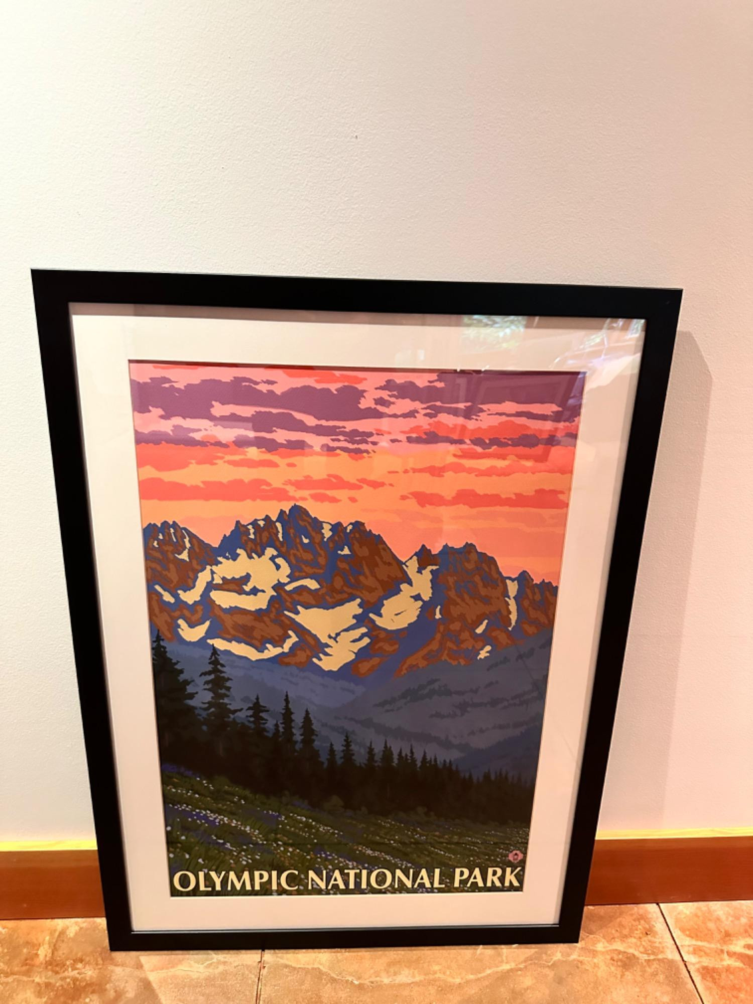 A framed decorative poster depicting Olympic National Park at sunset or sunrise. Stylized mountain landscape Vivid sunset colors Bold title text “OLYMPIC NATIONAL PARK” Printed on paper, encased in a glass-fronted frame Approximately measuring 36 x 27 inches