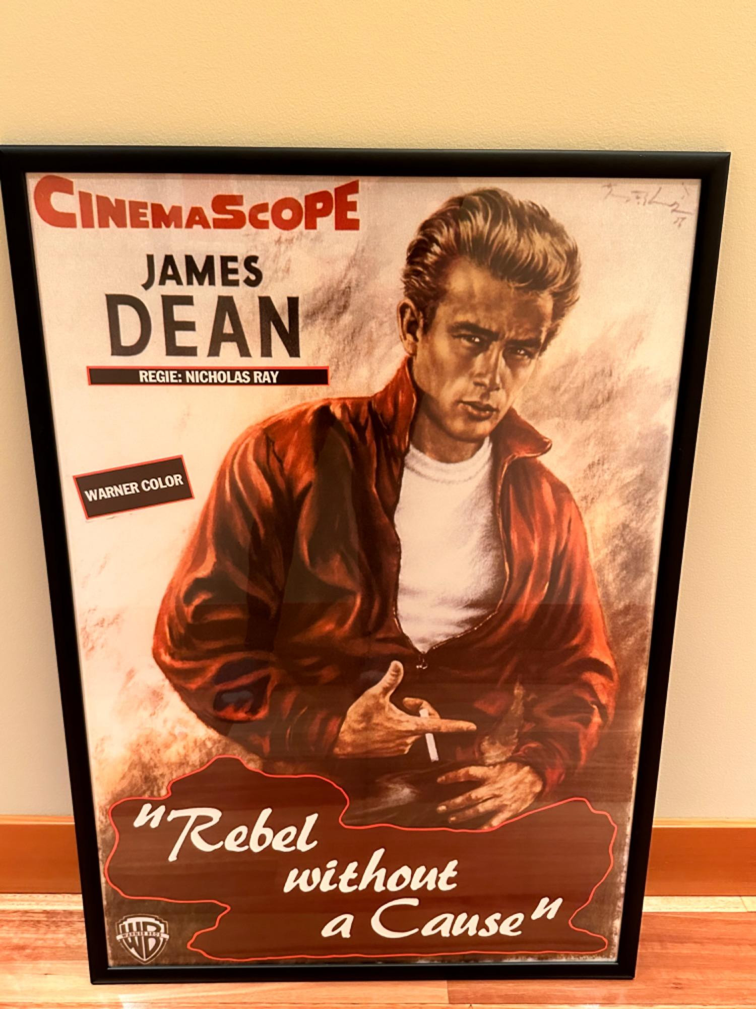 Warner Brothers ‘Rebel Without a Cause’ James Dean Movie Poster A vintage movie poster featuring James Dean for the film “Rebel Without a Cause.” Iconic status of James Dean Classic nature of the film Standard poster paper-reproduction