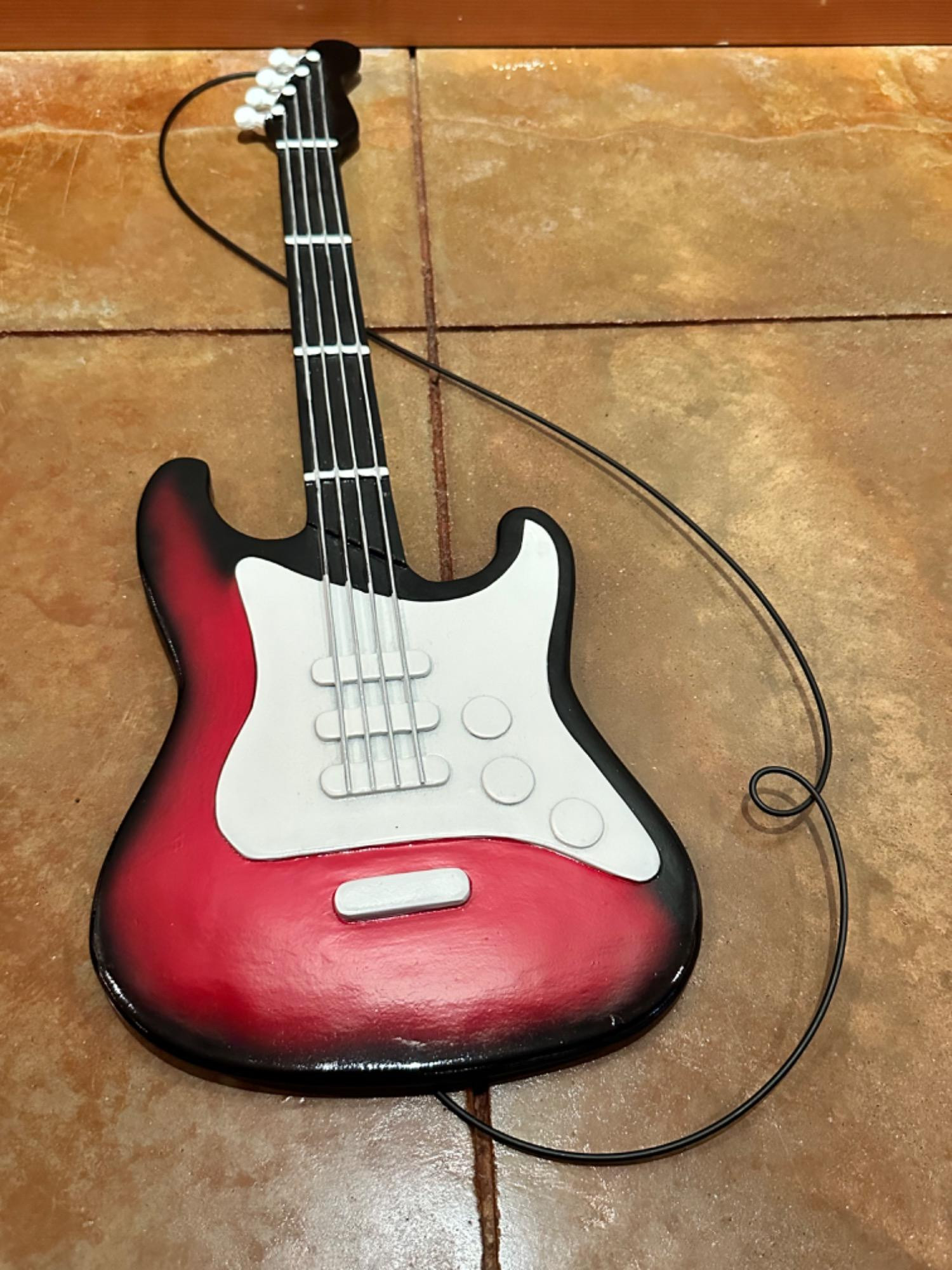 A decorative wall hanging designed to resemble an electric guitar. Decorative purpose Electric guitar design Fused Glass Approximately 24 x 8
